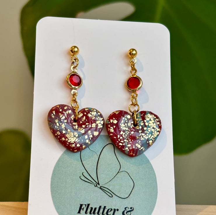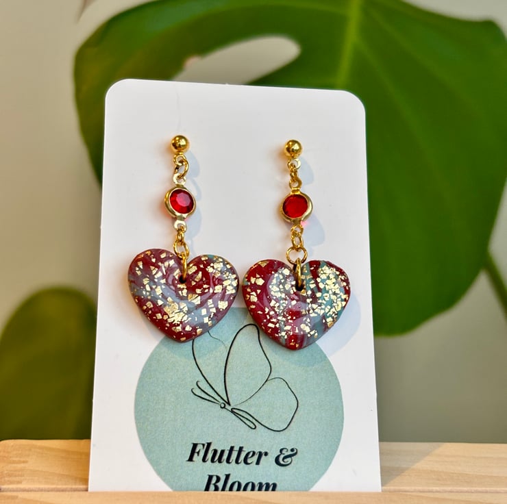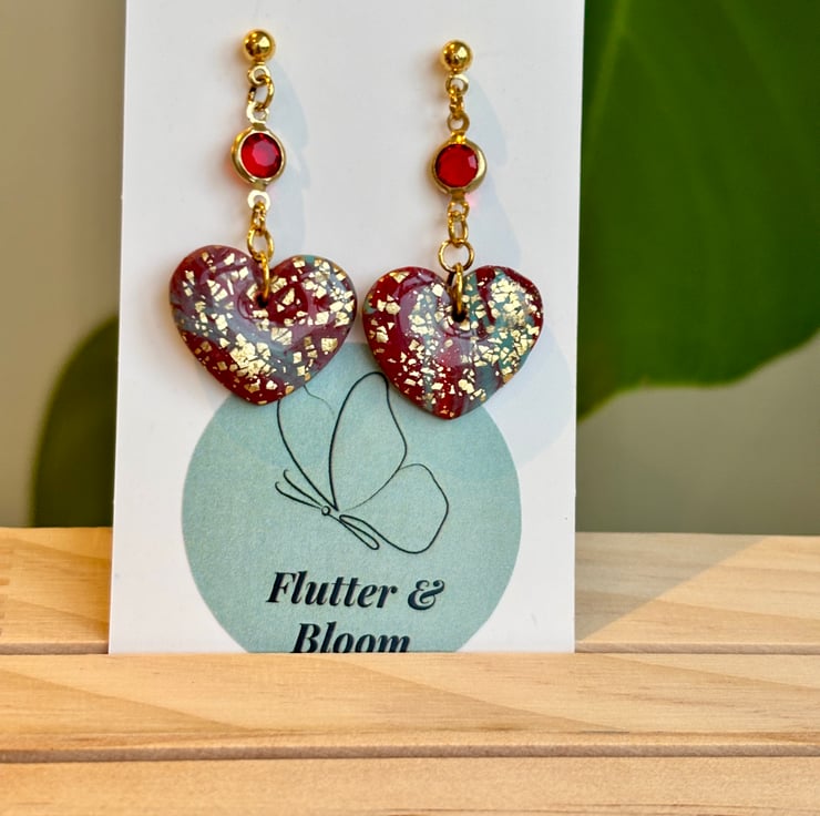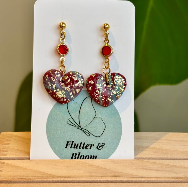 Handmade with love and a touch of firelight, these romantic drop earrings feature deep red polymer clay hearts suspended beneath glimmering gold-set gems. Each heart is flecked with golden foil, sealed in a glossy resin finish that catches the light like embers in twilight. The gold studs and crimson accents evoke warmth, passion, and timeless charm—perfect for gifting or adorning your own story. Lightweight, elegant, and full of soul, they’re a wearable whisper of love and magic.