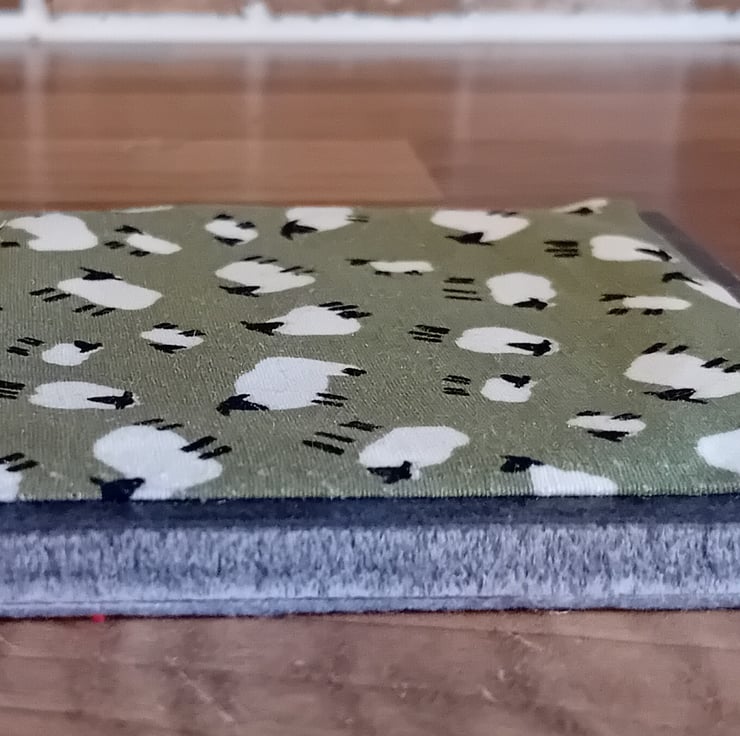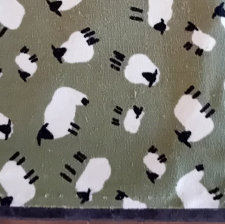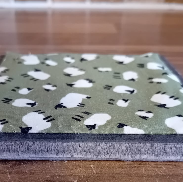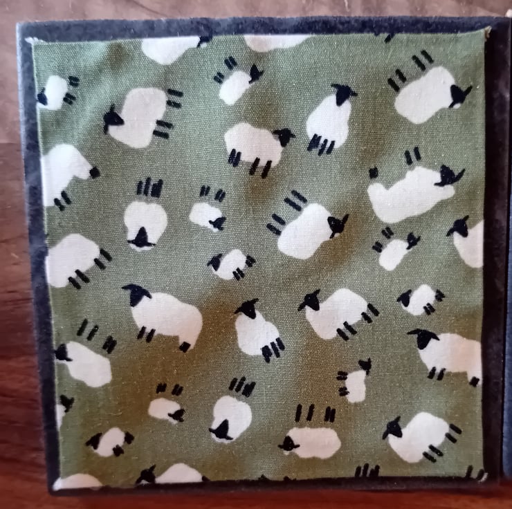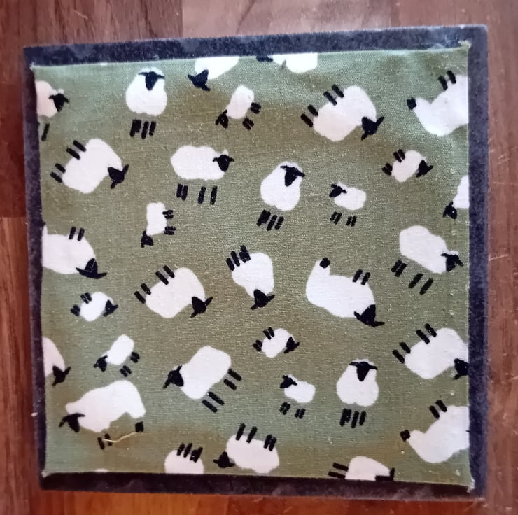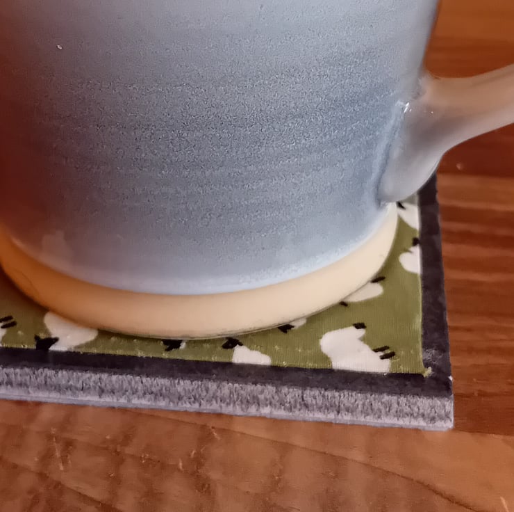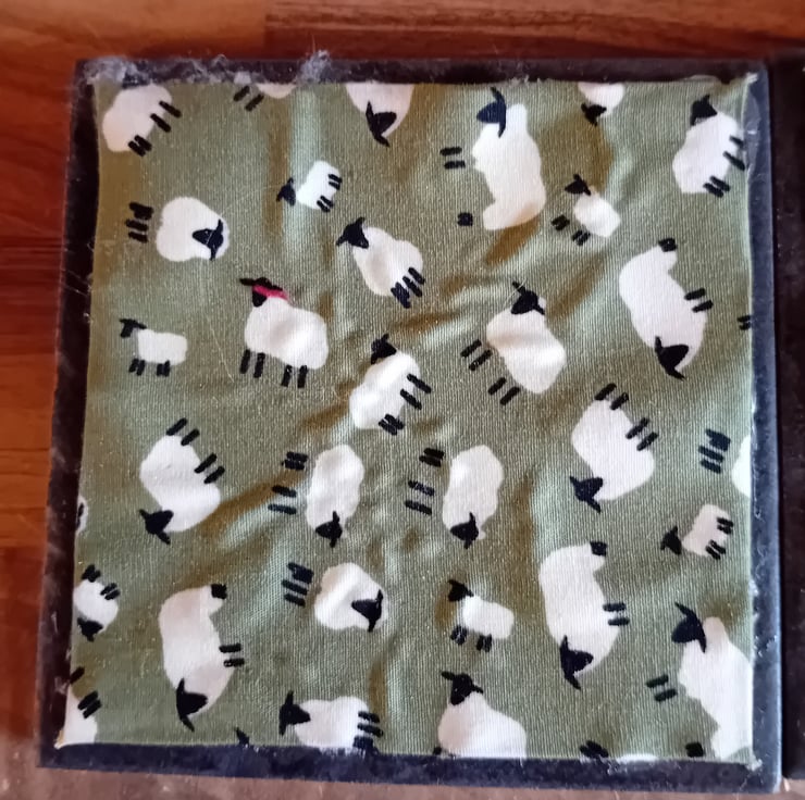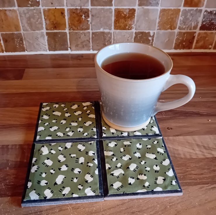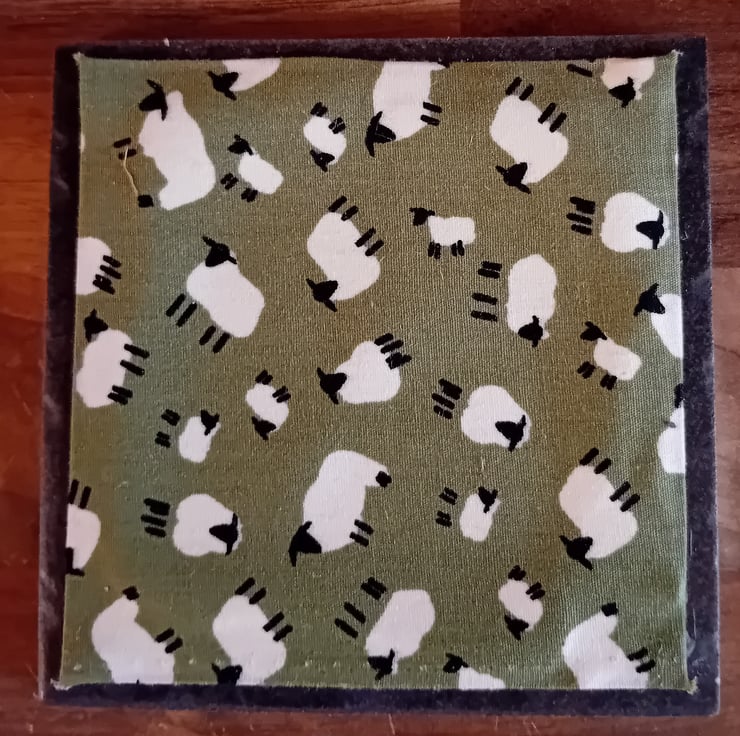 Each coaster measures 10cm x 10cm and is made with a ceramic tile base, finished with a felt backing to help protect surfaces. The top features a fabric square created using fabric scraps and found fabrics, layered over pelmet material to give a firm, practical base.