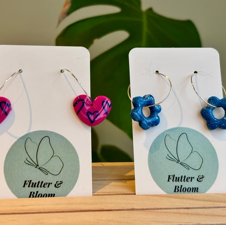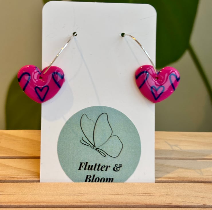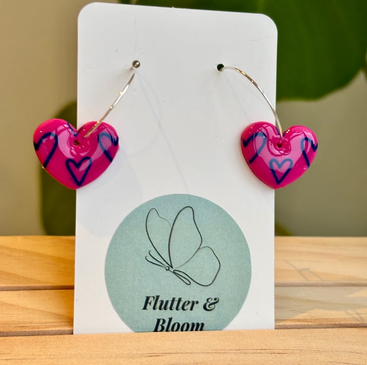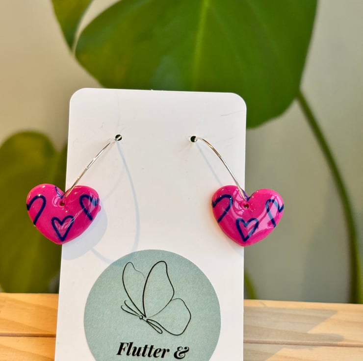 Playful and full of heart. These handcrafted magenta pink earrings feature tiny heart motifs all nestled in a bold heart shape. Dangling from sleek metal hoops, they’re perfect for colour lovers, art dreamers, and anyone who wants to wear joy.