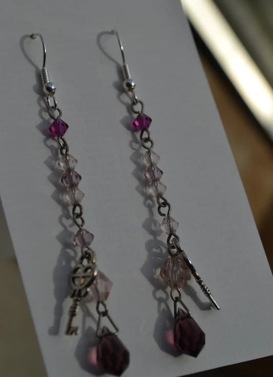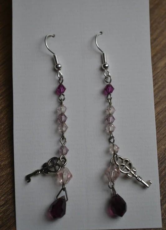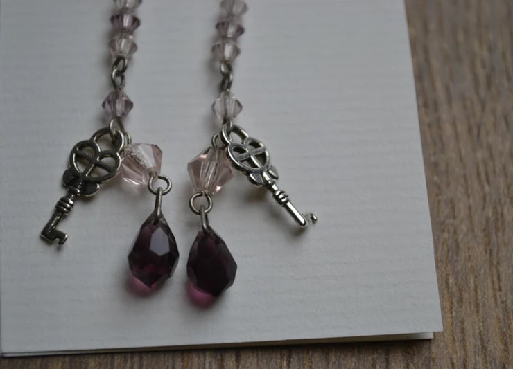 Extra long dangle approx 6cm pink and purples crystal beads with tibetan silver key charms on nickel free wires nice teardrop purple crystal at end. Will come carded and in a gift bag.