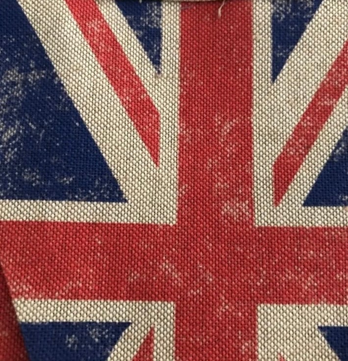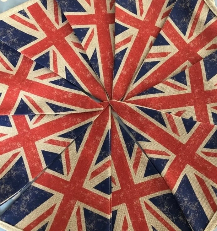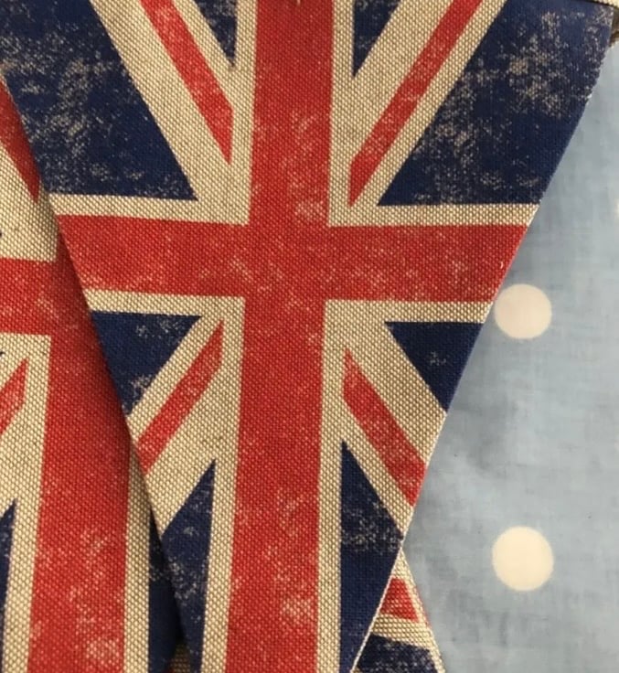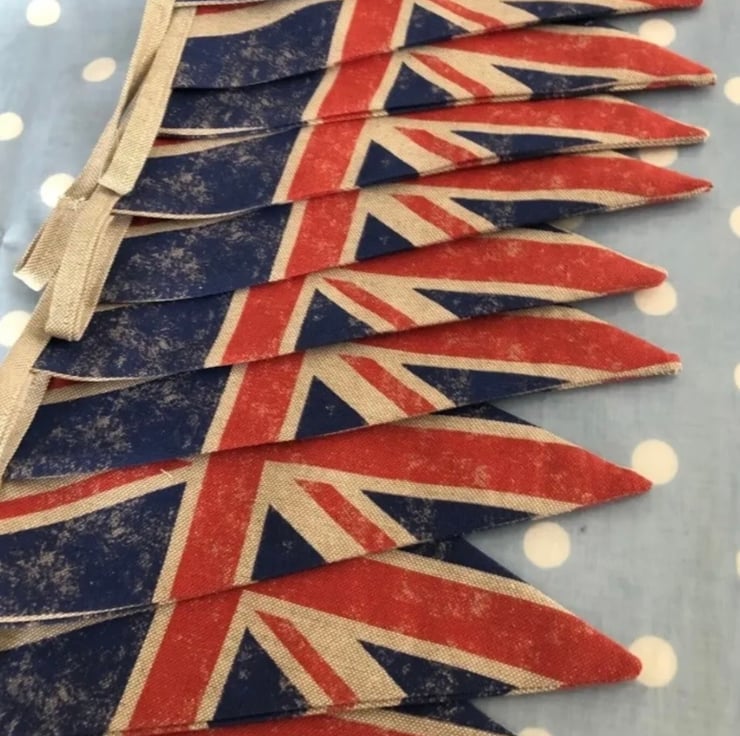 10 ft Union Jack bunting, each square measures 18 cm wide and 22 cm tall, double sided so the same fabric on the back and made with linen fabric then finished with linen binding