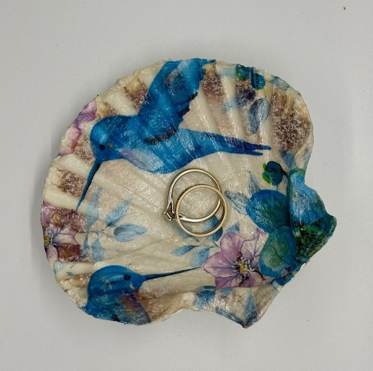 A smaller counterpart to the matching soap holder (see my shop) this pretty little ring holder has a vintage style design on a white washed base with a pearlescent blue accent.