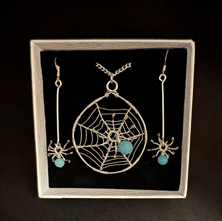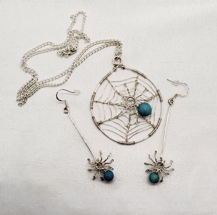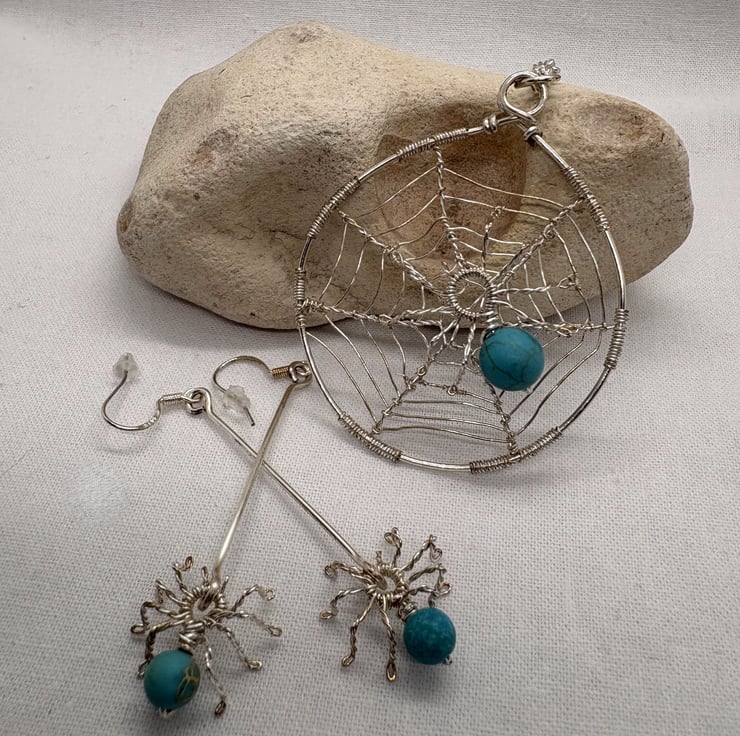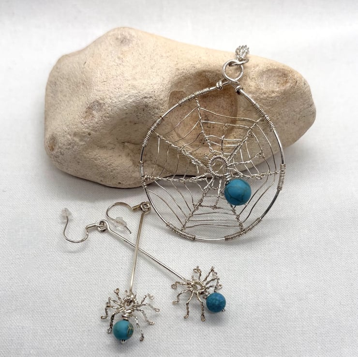 Silver plated copper wire wrapped spider on web and spider earring set with turquoise semi-precious stone beads for the spiders bodies. Comes with a silver-plated 20"/50cm chain and 925 stamped silver earring fish hook fittings. The spider earrings have been created to look as though they are dangling from spun web strands.