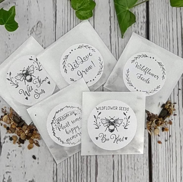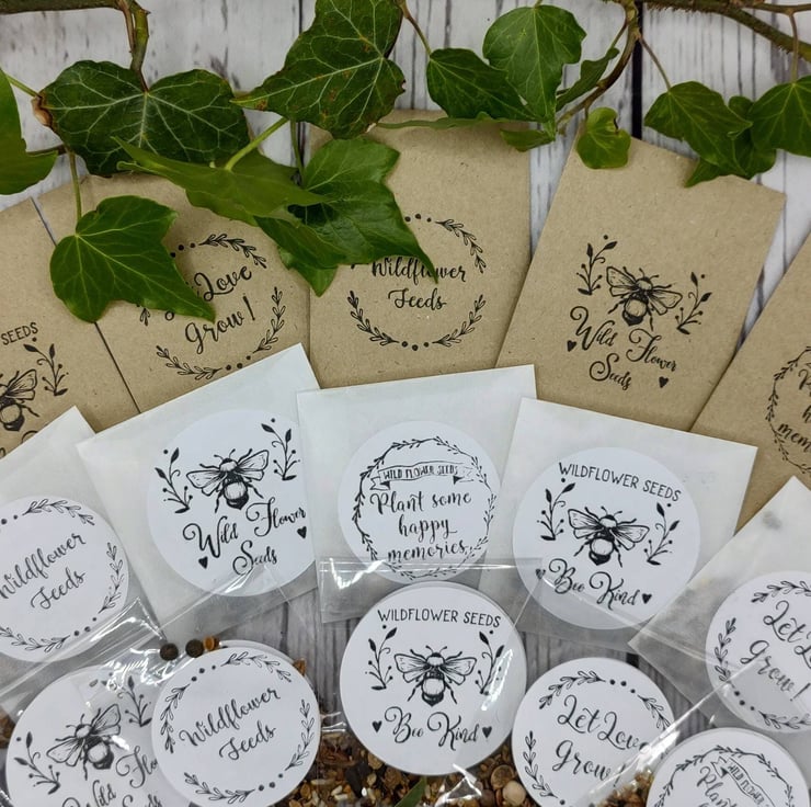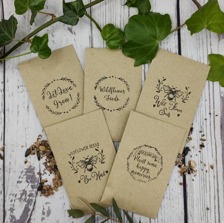 Bee & butterfly friendly wildflower seeds 5 hand-stamped designs brown recycled manilla, clear cellophane or white glassine packets