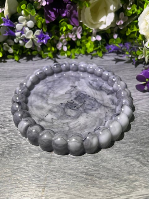 A handmade round bubble tray in black and white. Approximately 13.5cm in diameter and 1.5cm in height, perfect for jewellery, keys, chocolates, soap, you name it! Each piece is unique and comes gift-wrapped, perfect for gifting or treating yourself.