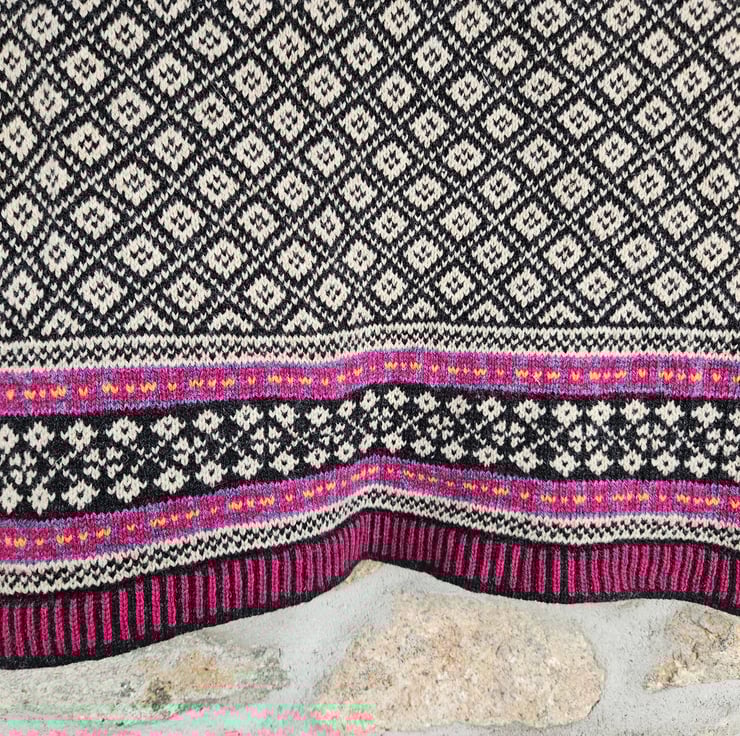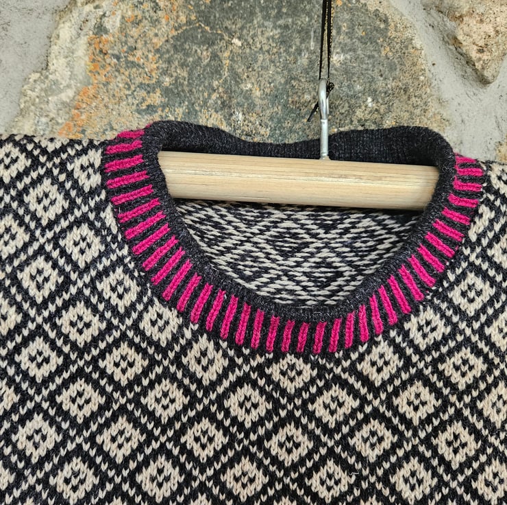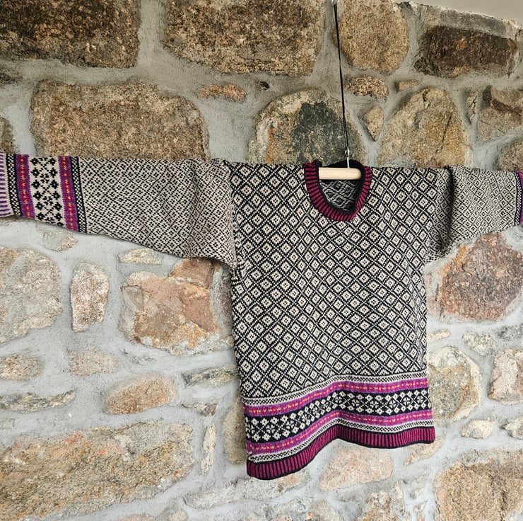 A cosy wee boxy jumper, knitted on my vintage hand-frame machine in beautiful supersoft lambswool. This jumper has a contrasting border and a two-tone main body. The sleeves reverse the two main colours and feature a smaller overall pattern. The jumper is a shorter, boxy style (approx 58cm) and is available to order in sizes small (approx size 10) to xxl (approx size 18). Please state size when ordering. As these items are made to order, delivery is approx 2-4 weeks.