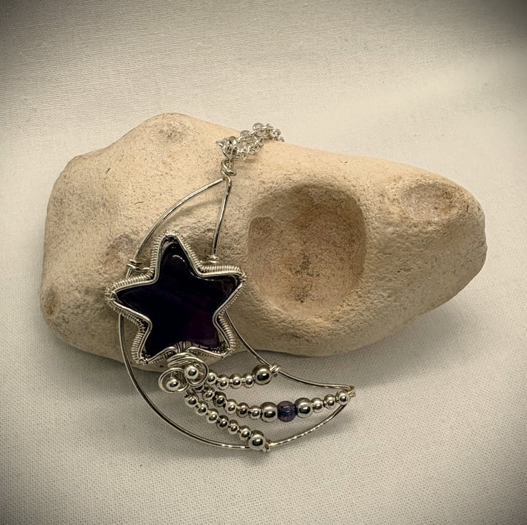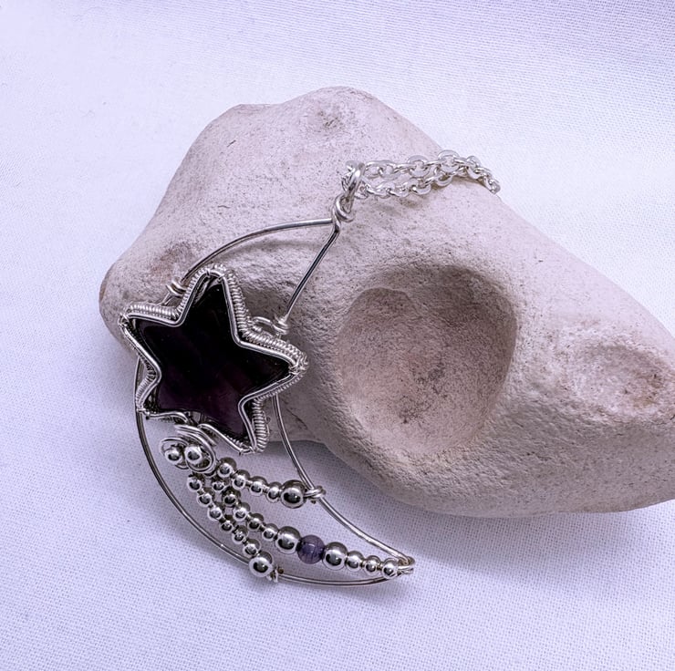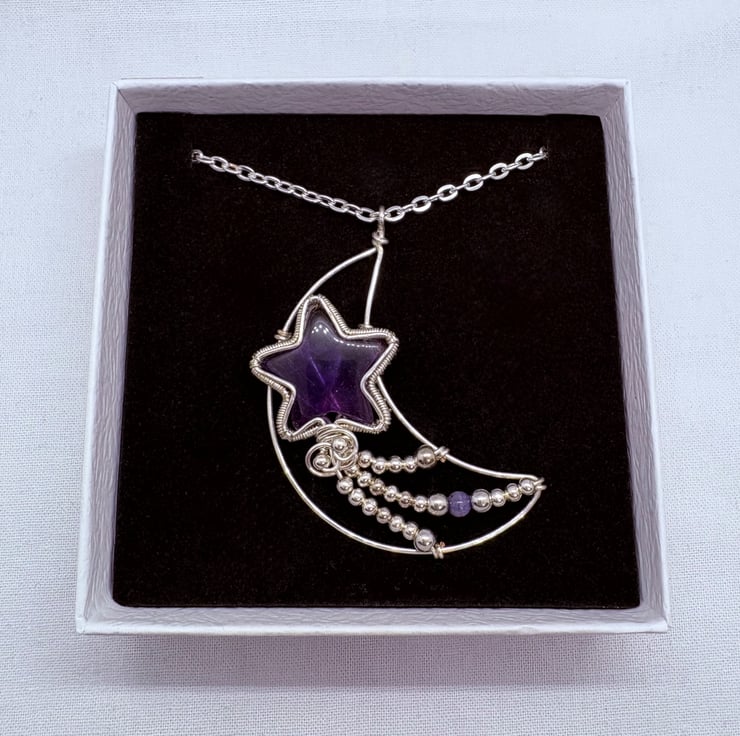 Silver plated copper wire wrapped crescent moon pendant with a beautiful Amethyst start shaped stone, an amethyst bead and silver plated copper beads.