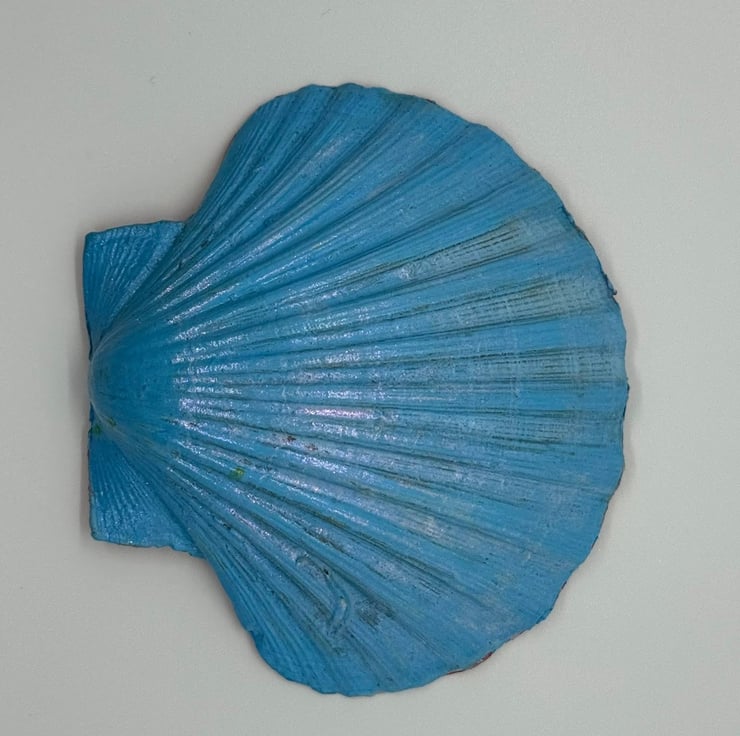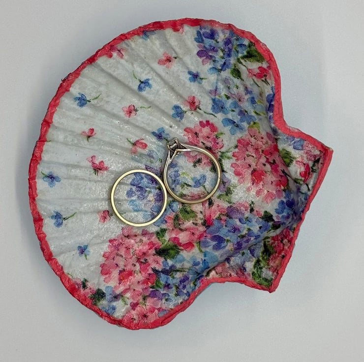 Scallop shell with a floral decoupage finish with pink edging and a blue, shimmer finish base.