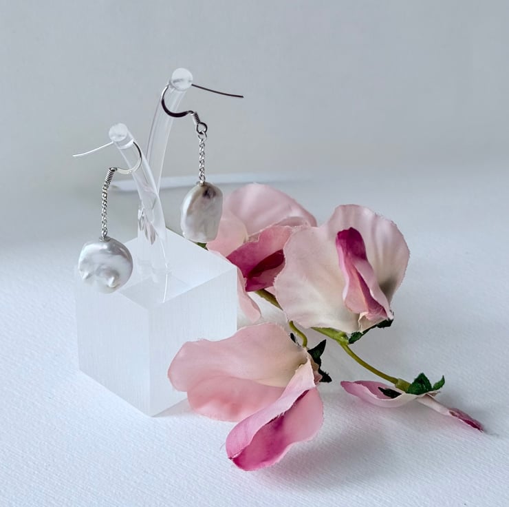 Long drop 10mm coin pearl earrings, unique and non-uniform pearls