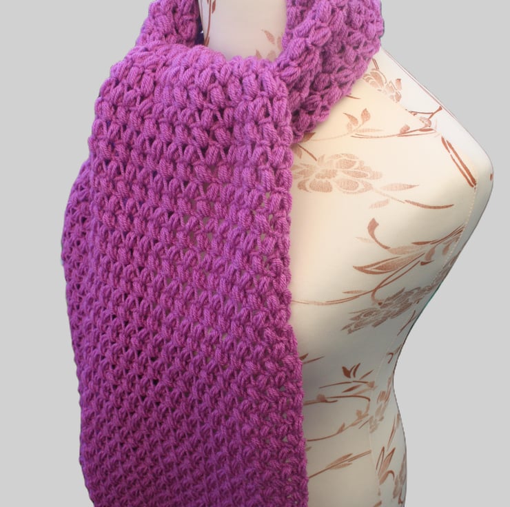 An absolutely beautiful orchid handmade scarf with gorgeous tones of colour and texture. The rich colour of the scarf is very pretty. The scarf measures approximately 74 inches (L) by 11 inches (W).