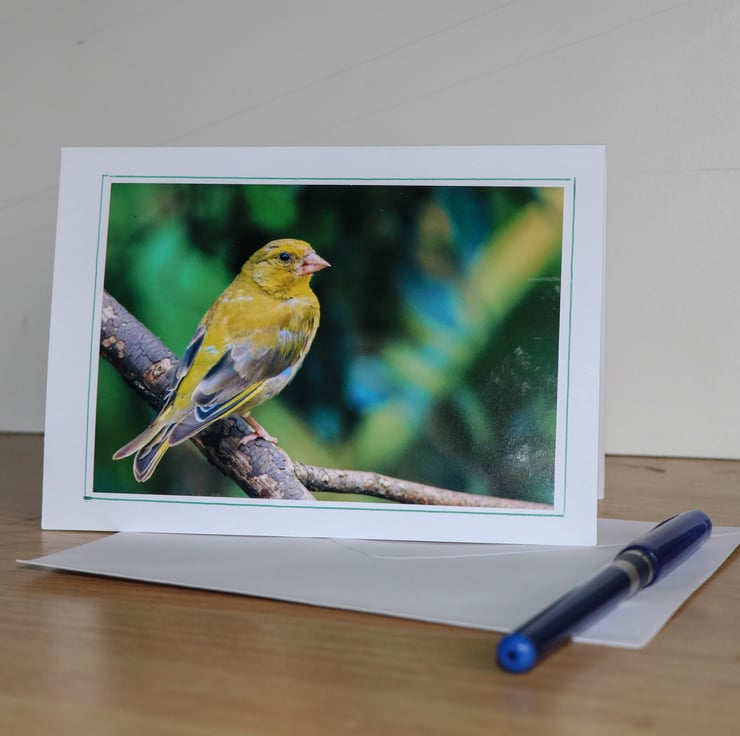 Admire the delight of garden birds with this art card featuring an original photograph of a Male Greenfinch in the garden., in its Spring breeding plumage. Printed on high-quality card stock, blank inside for your own message. Perfect for birthdays, thank-yous, or seasonal notes. Comes with a plain white envelope.