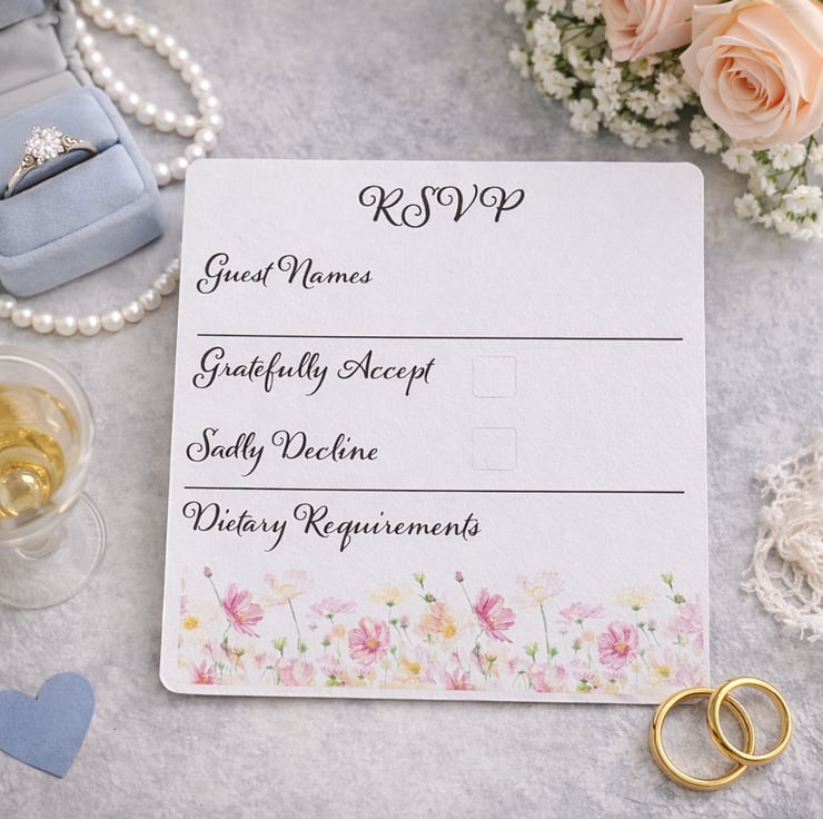 Printed on high quality card with gently rounded corners, each piece is thoughtfully laid out to ensure clarity and ease for your guests. The full-size RSVP card provides generous space for responses, including acceptance or decline and dietary requirements, while the information card allows you to share venue details, timings, accommodation or gift information without overcrowding the invitation.