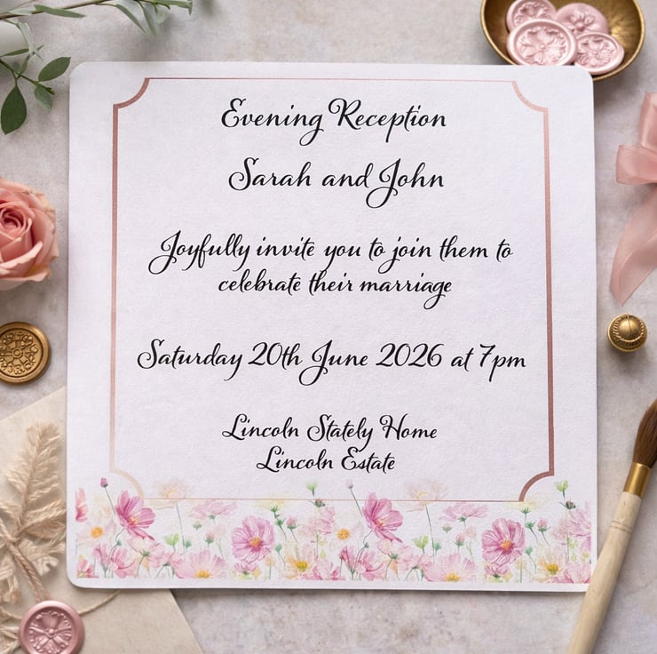 Printed on high quality card with gently rounded corners, the evening reception invitation presents your event details clearly and stylishly. Each invitation is paired with a handmade envelope, adding a premium, handcrafted finish that feels special from the moment it is received.