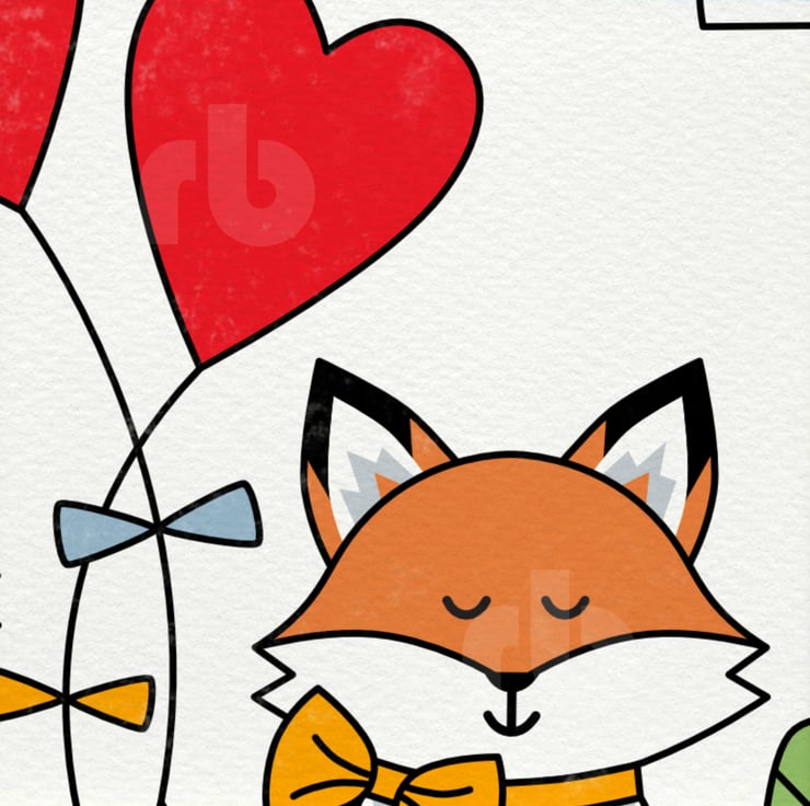 Illustration of two foxes with love hearts tied to their tails.