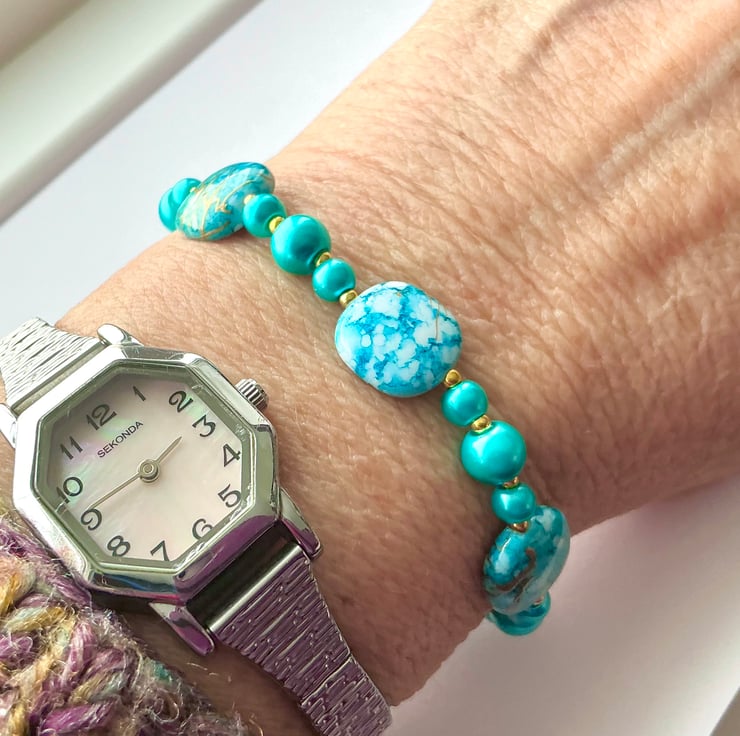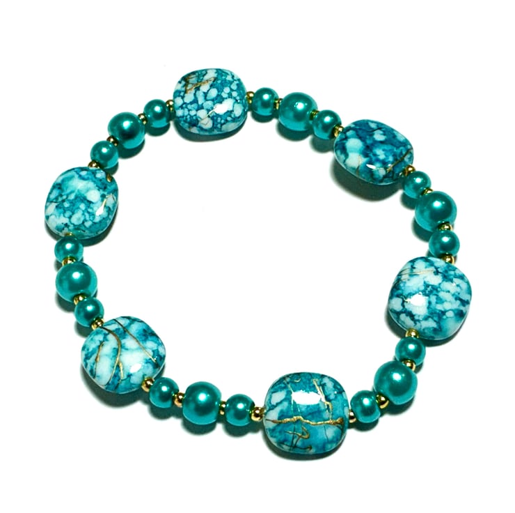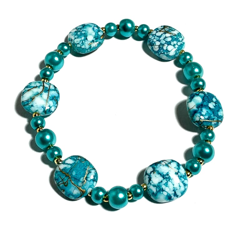 This delicate little beaded bracelet is an easy to wear elasticated design made using faux pearls and patterned beads with a mottled design, interspersed with tiny golden metal beads.