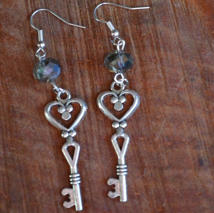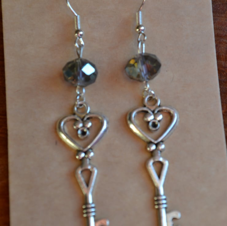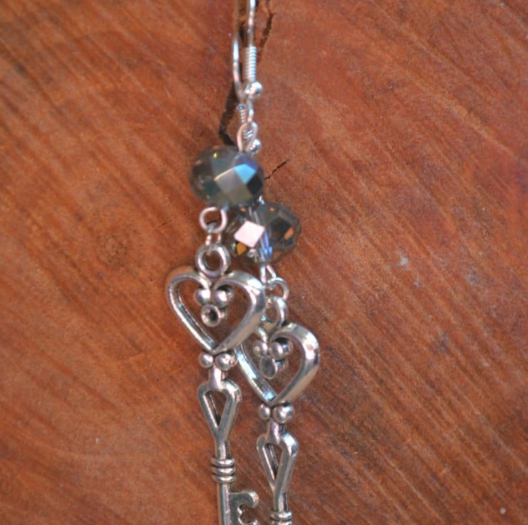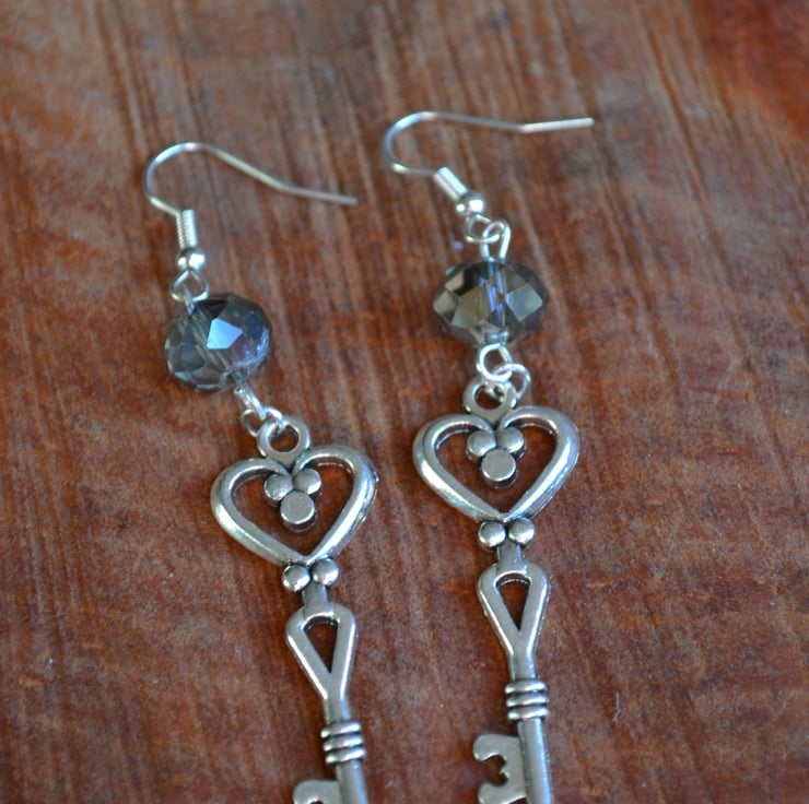 These are statement large earrings with large Steampunk keys and a large smokey grey AB style crystal 6cm drop long dangle on nickel free wires