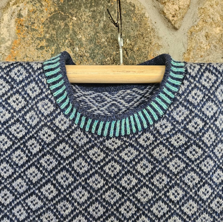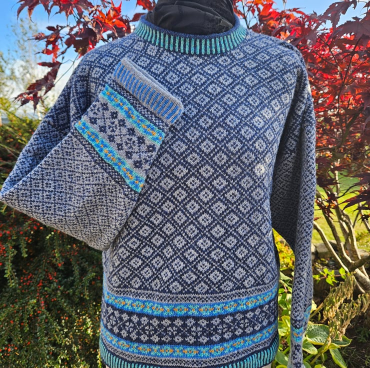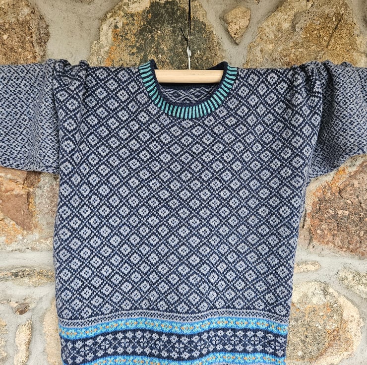 A cosy wee boxy jumper, knitted on my vintage hand-frame machine in beautiful supersoft lambswool. This jumper has a contrasting border and a two-tone main body. The sleeves reverse the two main colours and feature a smaller overall pattern. The jumper is a shorter, boxy style (approx 58cm) and is available to order in sizes small (approx size 10) to xxl (approx size 18). Please state size when ordering. As these items are made to order, delivery is approx 2-4 weeks.