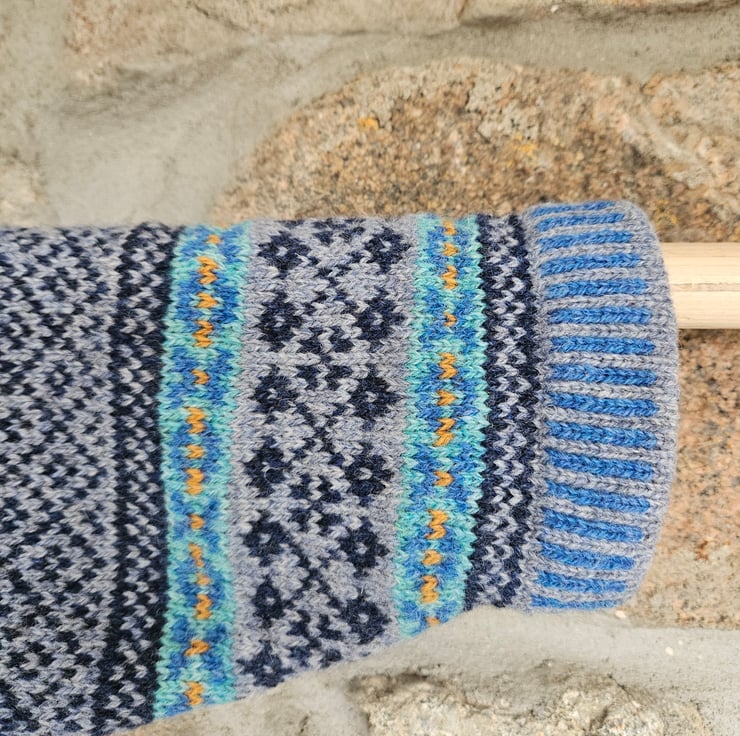 My knitwear is inspired by the traditional patterns of many countries but mainly Scotland and the Scandinavian countries. Fair Isle patterns feature frequently and I also invent patterns inspired by the area around me. The colours reflect the diverse landscapes of Aberdeenshire: the sea and coast and the mountains, forests and farmland.