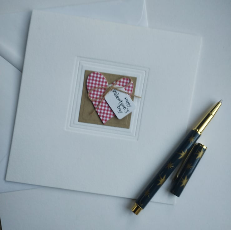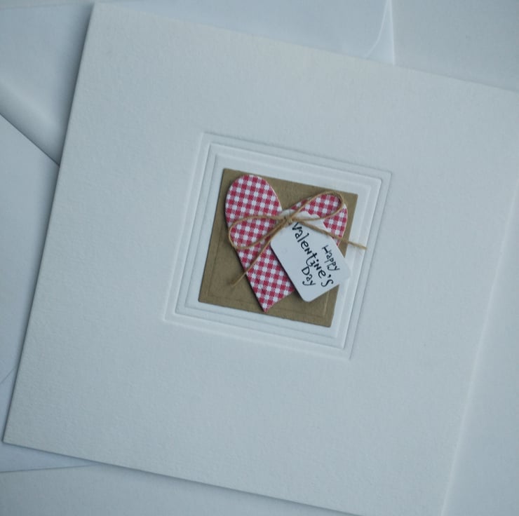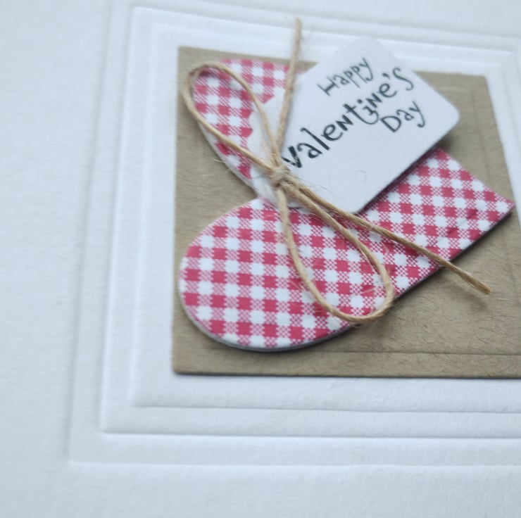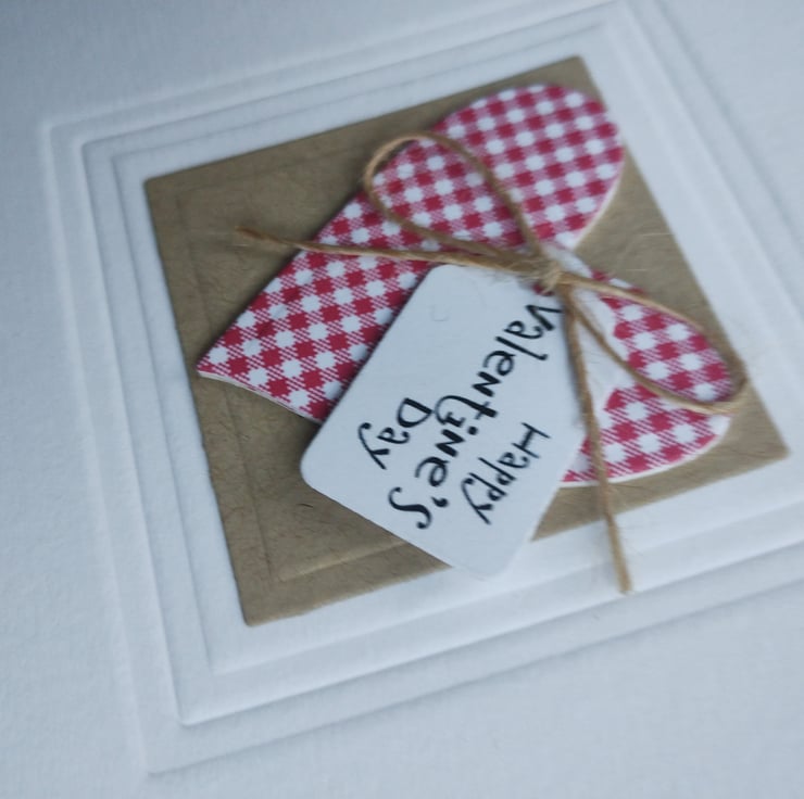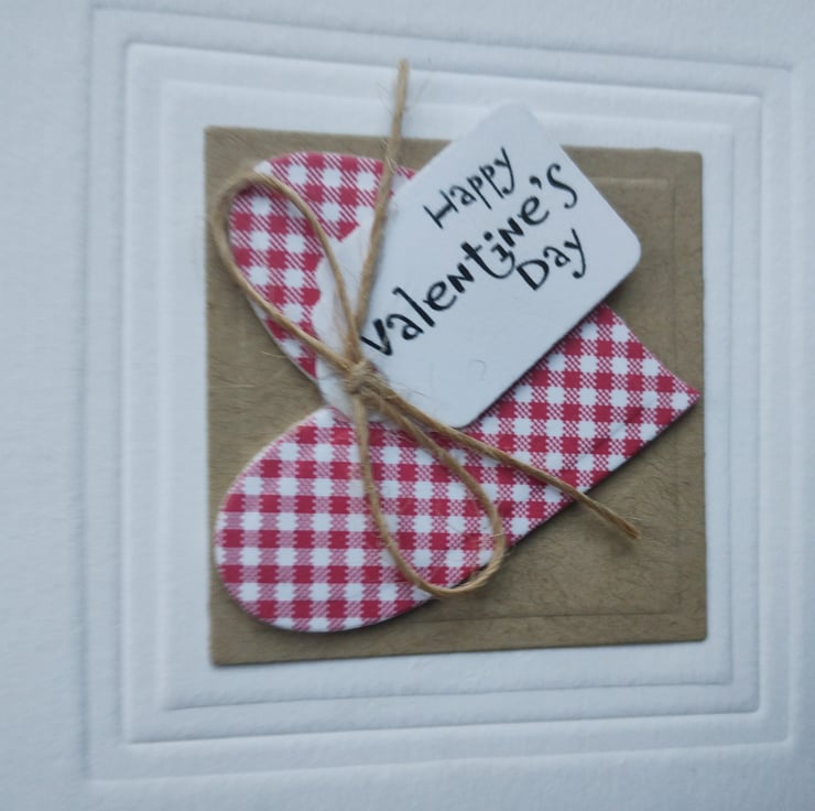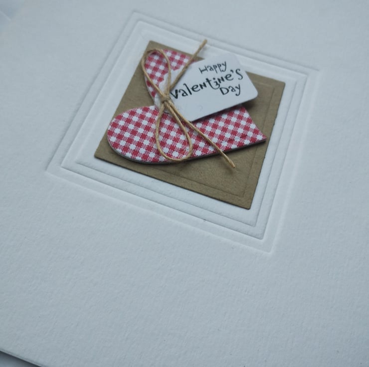 I've cut a heart from red and white gingham card and layered for depth. I've printed a small tag with the wording Happy Valentine's Day in a quirky script and added a rustic craft bow. The heart is mounted on cut and embossed craft card square and I've embossed a further square around the element for a little added texture.