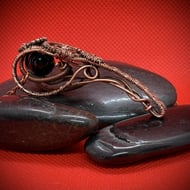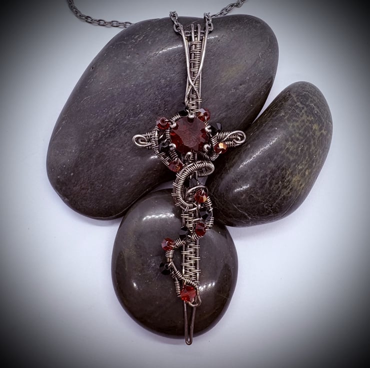 Gun metal tarnished silver plated copper wire wrapped sword pendant with a 10mm red glass crystal as a hilt detail and a snake wrapped around the sword with a red and black glass bi-cone beads. All the crystals are bought from a well known Austrian crystal manufacturer