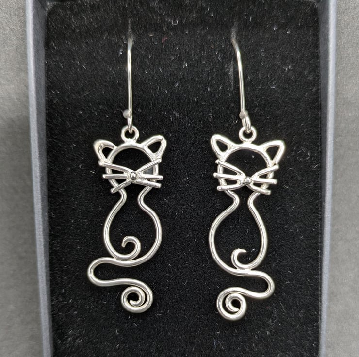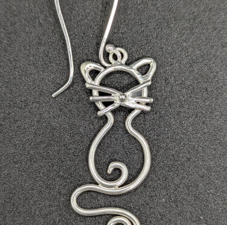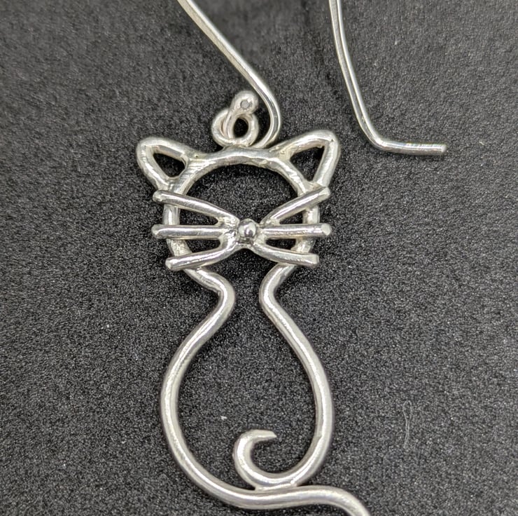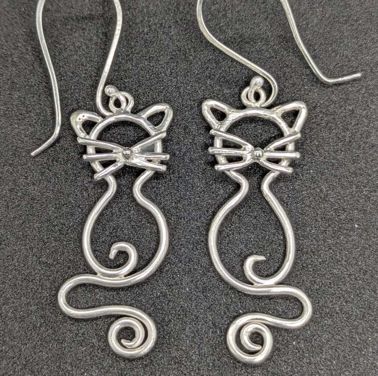 These statement cat earrings have been handcrafted from sterling silver and hang from handmade hooks. The cats feature sterling silver whiskers, a granulated silver nose and a beautifully hand forged sterling silver tail. They have been made as a reflective pair and are a fun look. A perfect gift for anyone who loves cats or who just likes talking about their earrings!