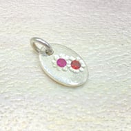Dainty silver textured pendant with a deep red faceted garnet, that has been flush set into the silver. Handmade using traditional metal smithing techniques.