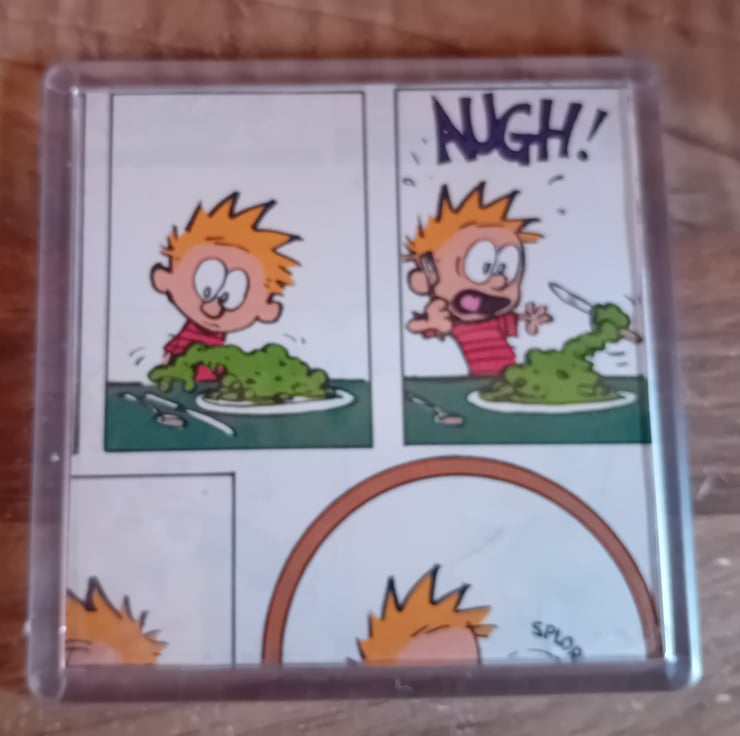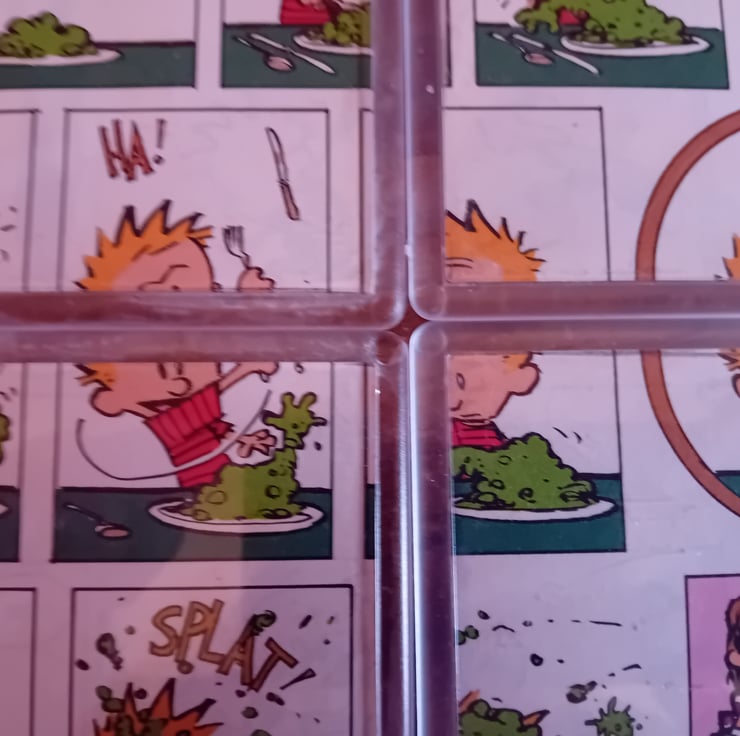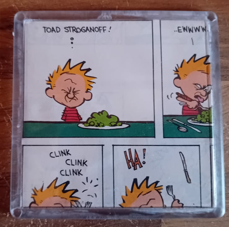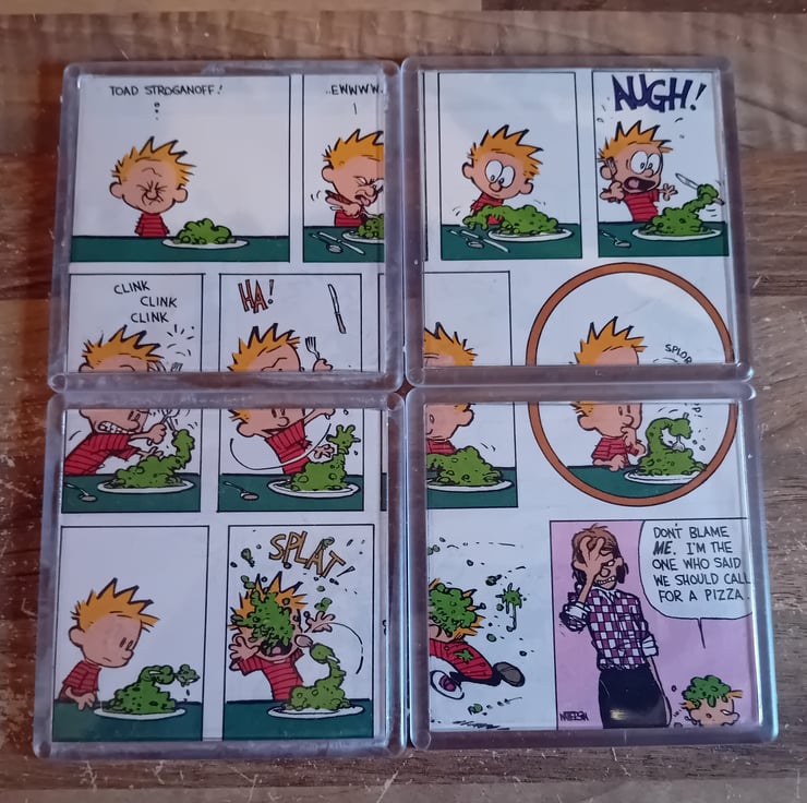 These small but characterful pieces are a lovingly upcycled comic cut-out, rescued from an old Calvin and Hobbes comic book and given a new life as a set of four coasters. They work indicvdially but put them together and hthey make up a complete set