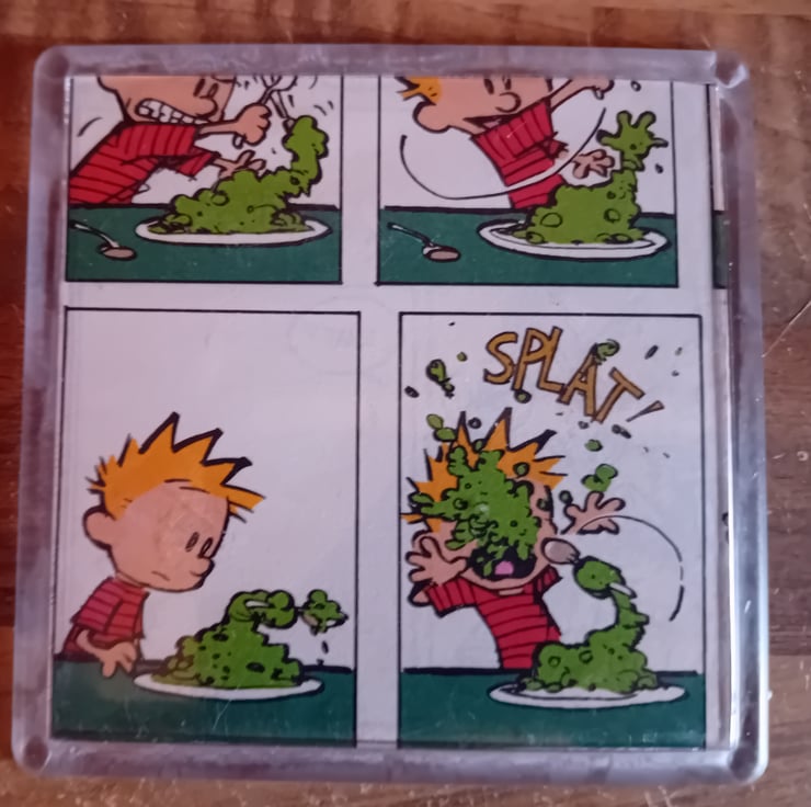 The image shows Calvin struggling to eat his greens