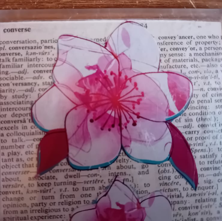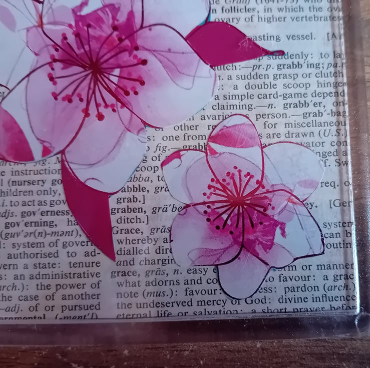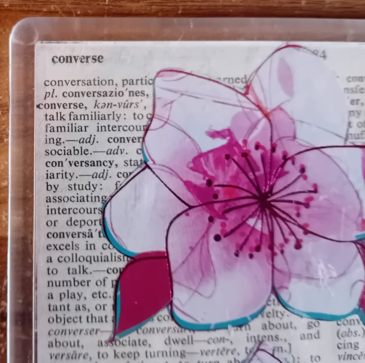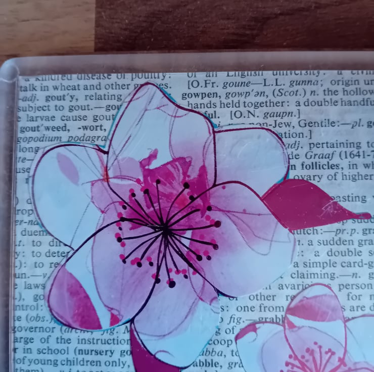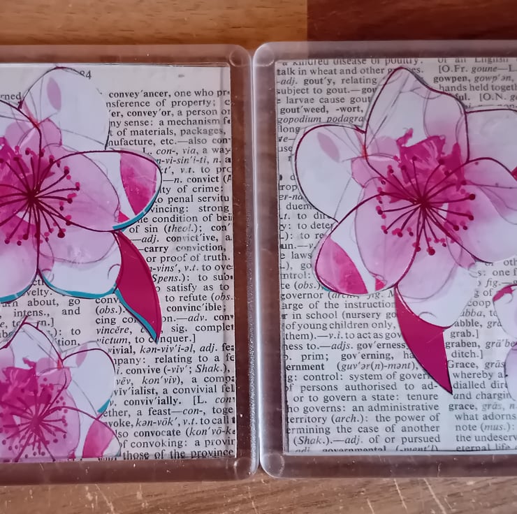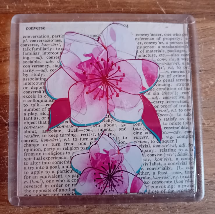 These two coasters have been made using old book pages and pink flowers upcycled from a previous paper project