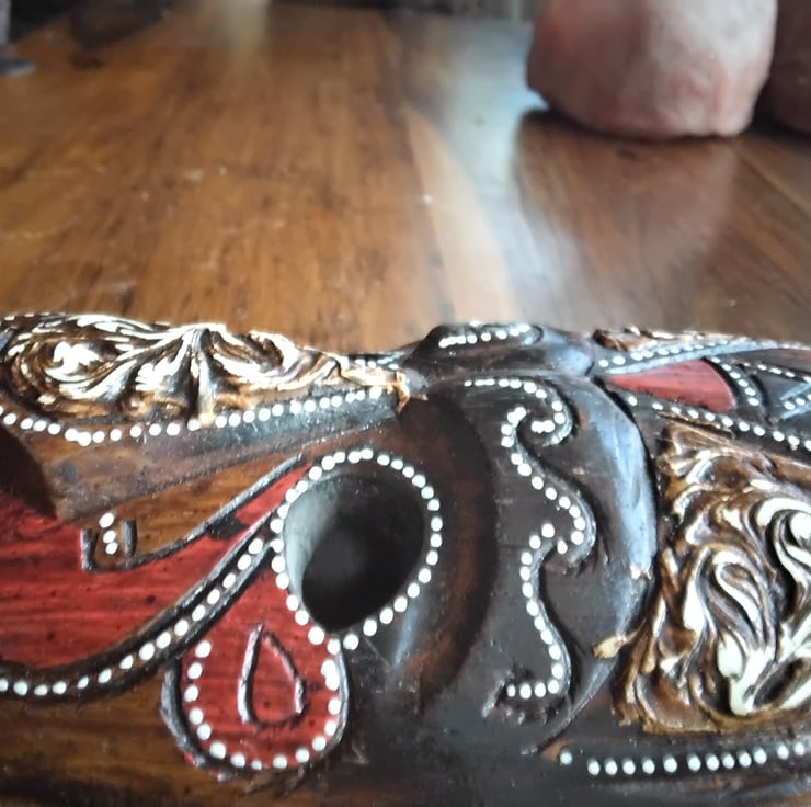 Vintage Balinese-style decorative mask intended.