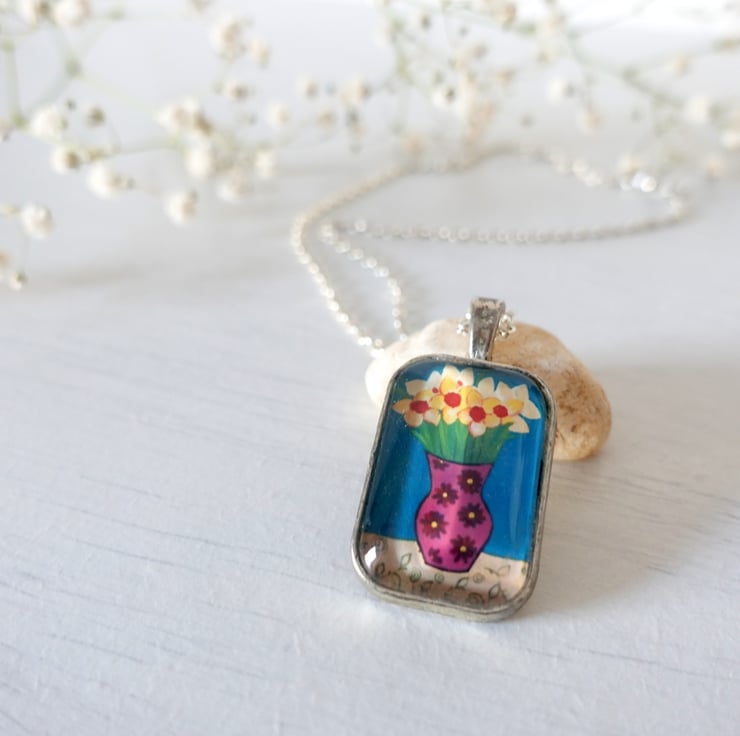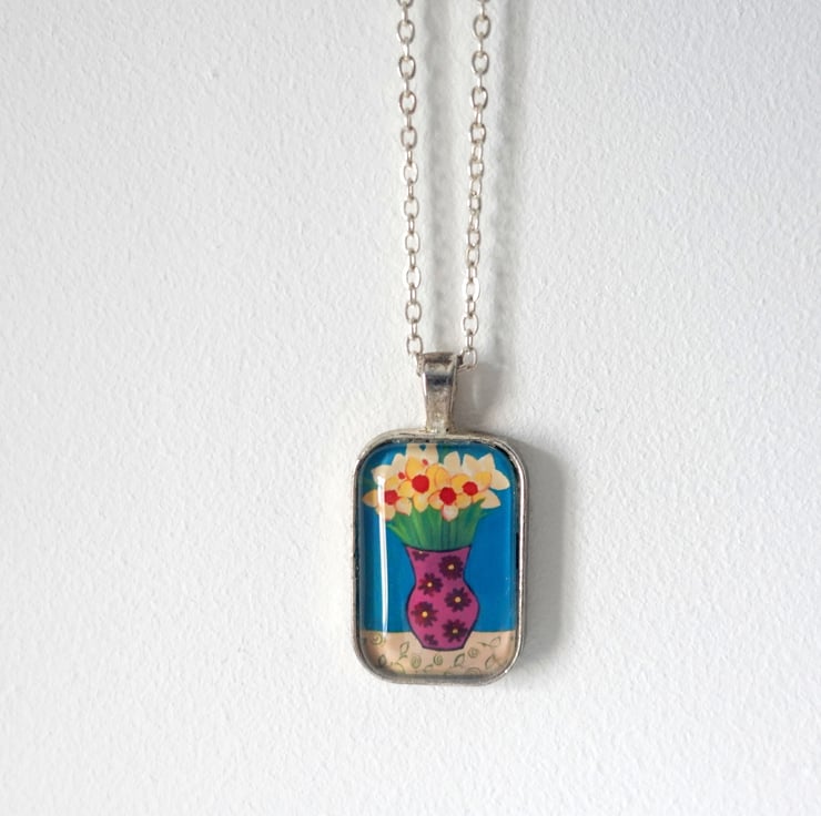 The matching necklace and earrings feature a bright bouquet of daffodil flowers arranged in a pink patterned vase, set against a rich blue background. Finished with smooth glass cabochons, the colours are vivid and glossy, making this set a joyful statement without being heavy to wear.