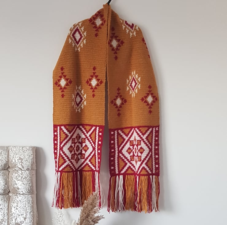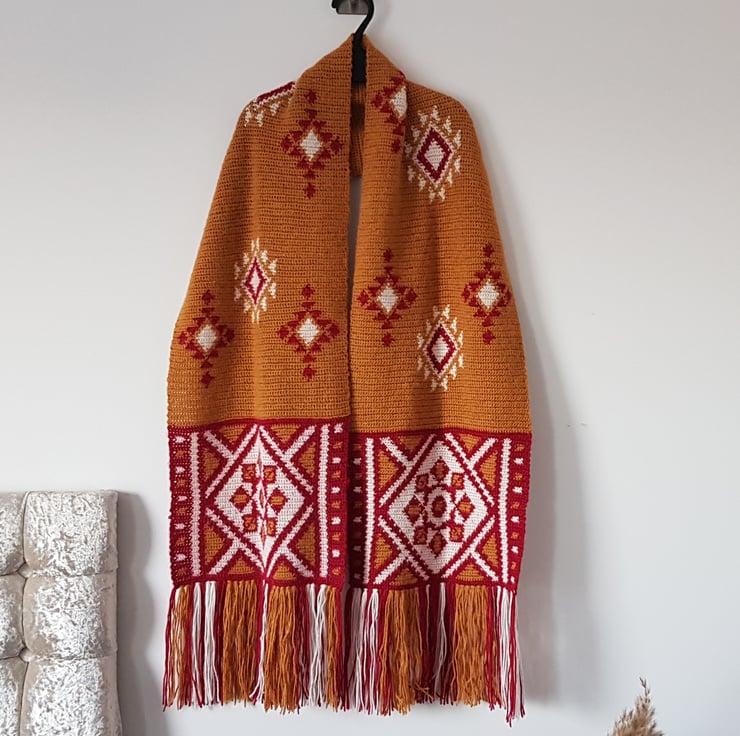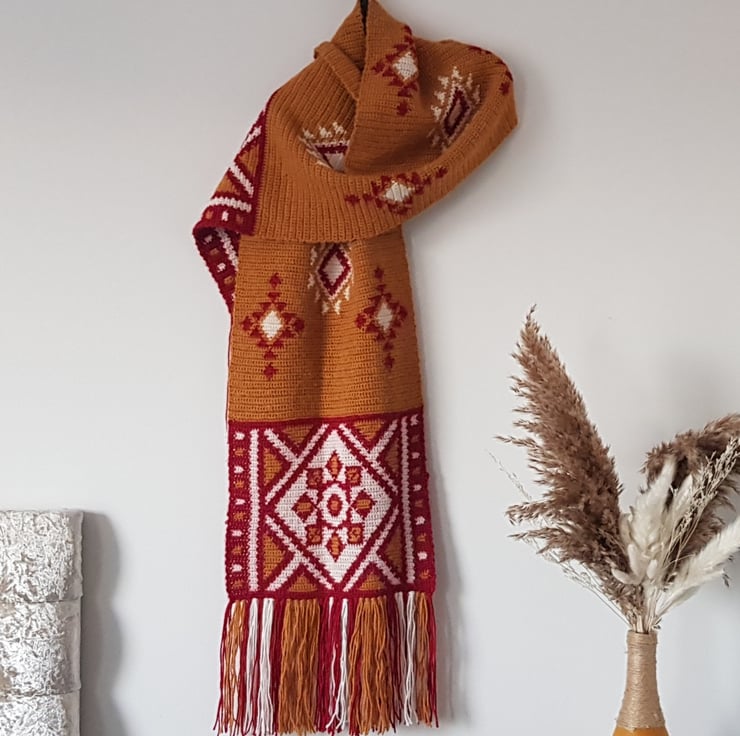 The Desert Ruby Scarf is designed for intermediate crocheters familiar with basic crochet stitches and techniques. It involves working with multiple colours using the intarsia crochet technique, which may require some practice if you’re new to colorwork.
