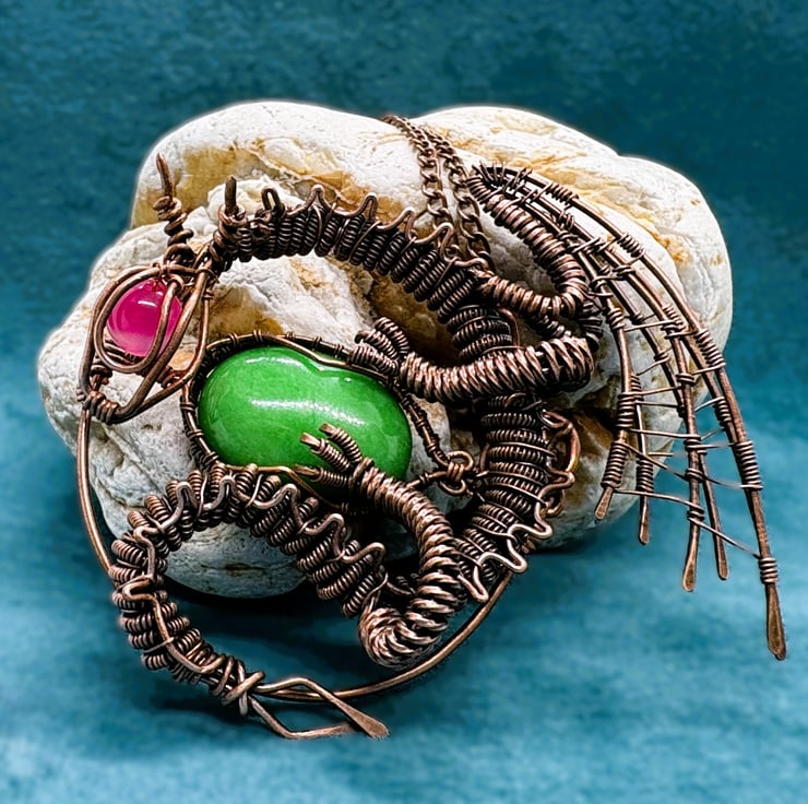 Antique copper wire wrapped Dragon pendant featuring a 25 x 18mm Green Aventurine oval cabochon and a 8mm pink Agate head bead.