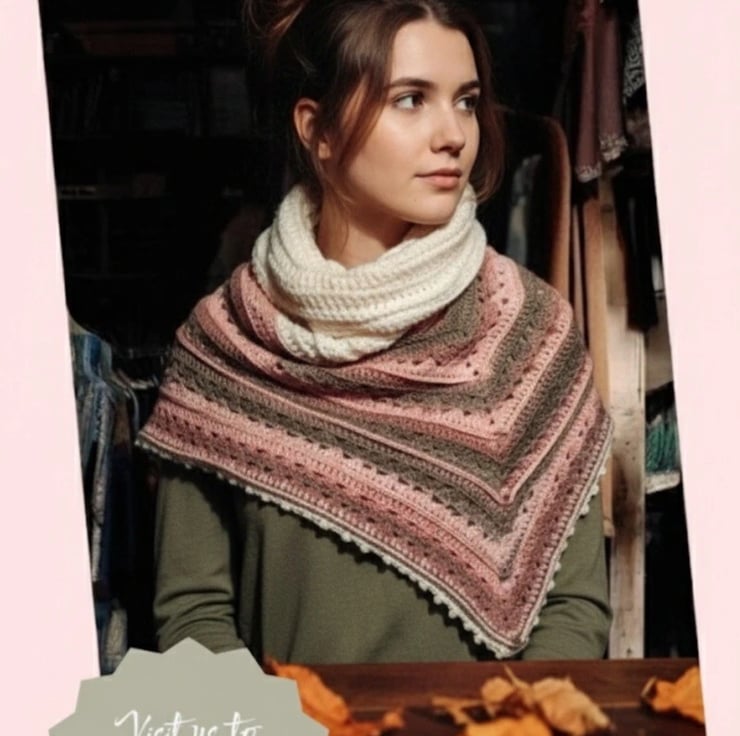 This isn't your average scarf. I wanted to create a statement piece that drapes beautifully over a coat or a simple jumper. By combining strips of dusty rose, clay, and deep mossy brown, I’ve built a gradient that feels grounded yet feminine. The piece features a mix of solid ribbing for warmth around the neck and intricate open-work stitches that give the triangular point its characteristic drape.