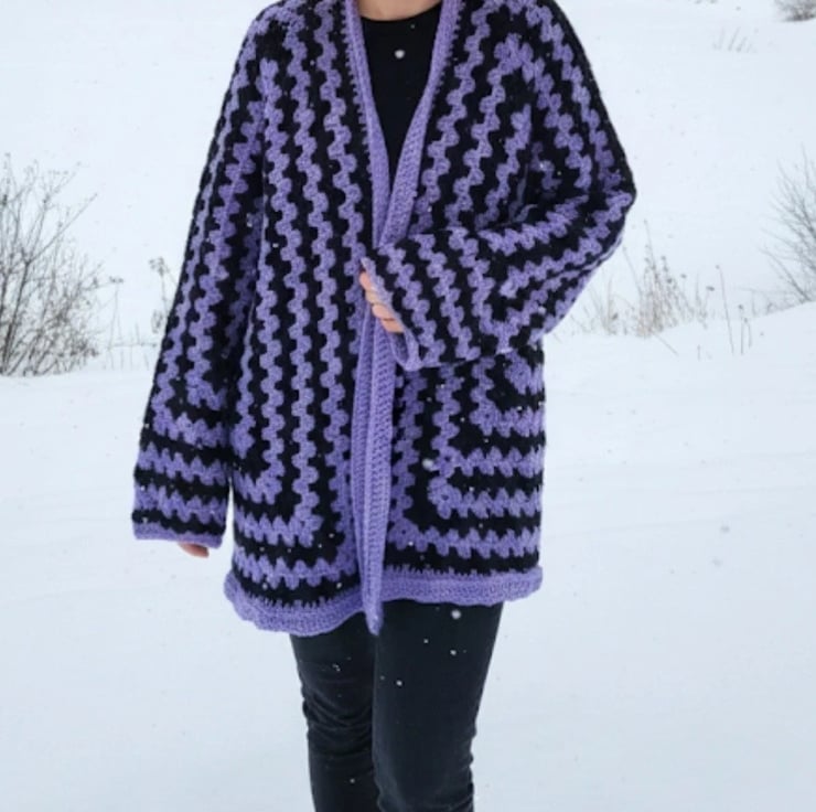 The body of the cardigan is constructed using a series of interlocking granny-style stitches, creating a mesmerizing hypnotic pattern of vibrant lavender and deep black. The open-front design is framed by a solid purple ribbed border, providing a clean, professional finish and a comfortable drape.