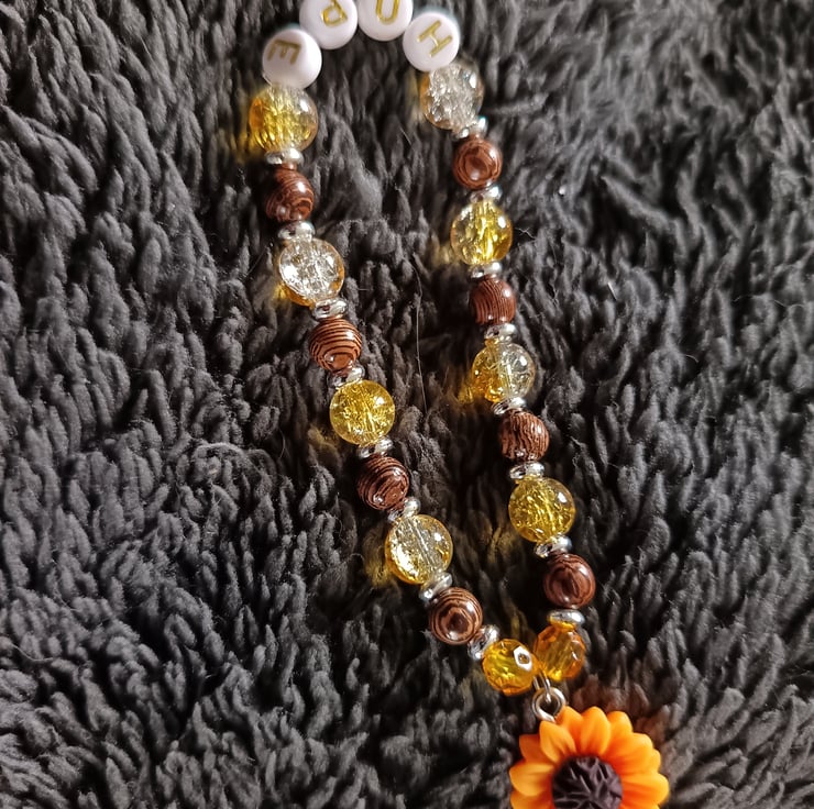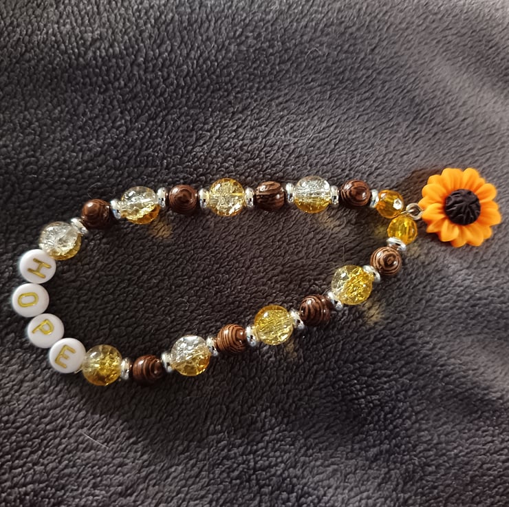 This handmade bracelet is crafted with magic stretch elastic, white and gold letter beads spelling "HOPE", brown wooden beads, silver decorative spacers and cracked yellow glass beads. This piece measures approximately 7 inches.