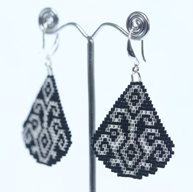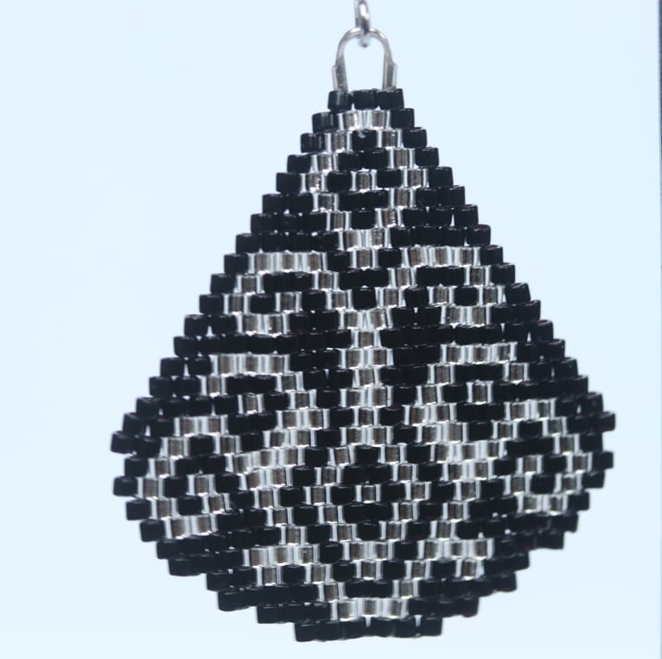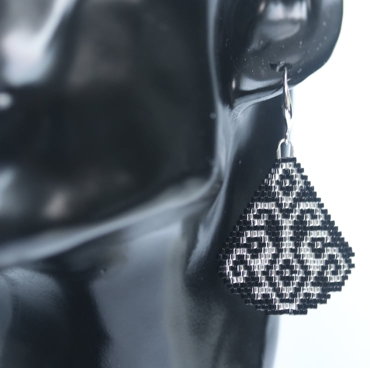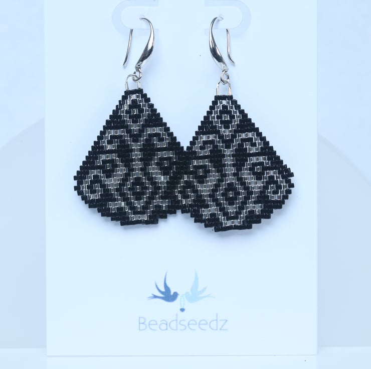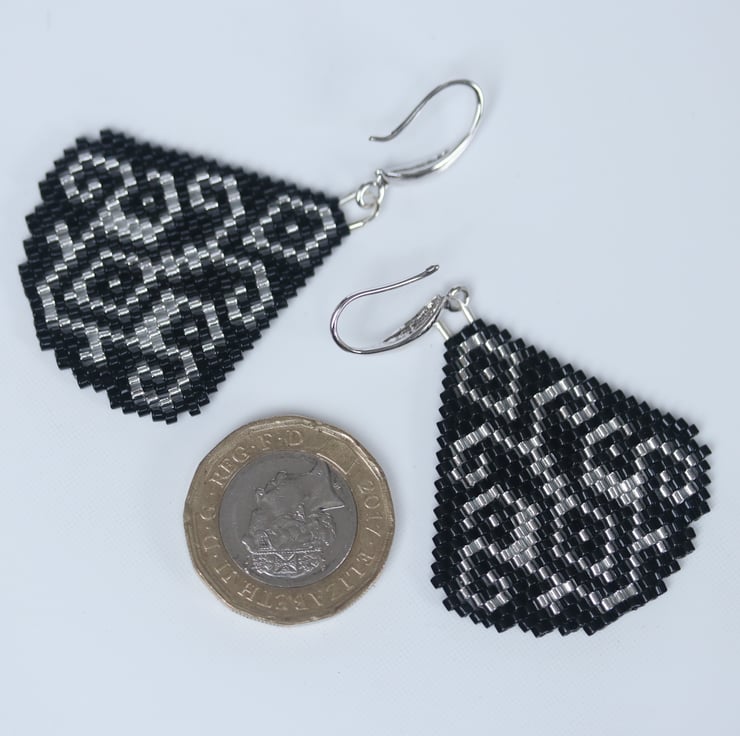Some pretty dangly earrings using neutral colours that make them really easy to wear with all kinds of styles. I’ve made them with tiny black and silver glass Delica beads, hand stitched using a classic brick stitch. The pattern is by Lutita a very clever Lithuanian designer. The design is double sided so that they look good from behind as well. The ear-wires are silverplated.
