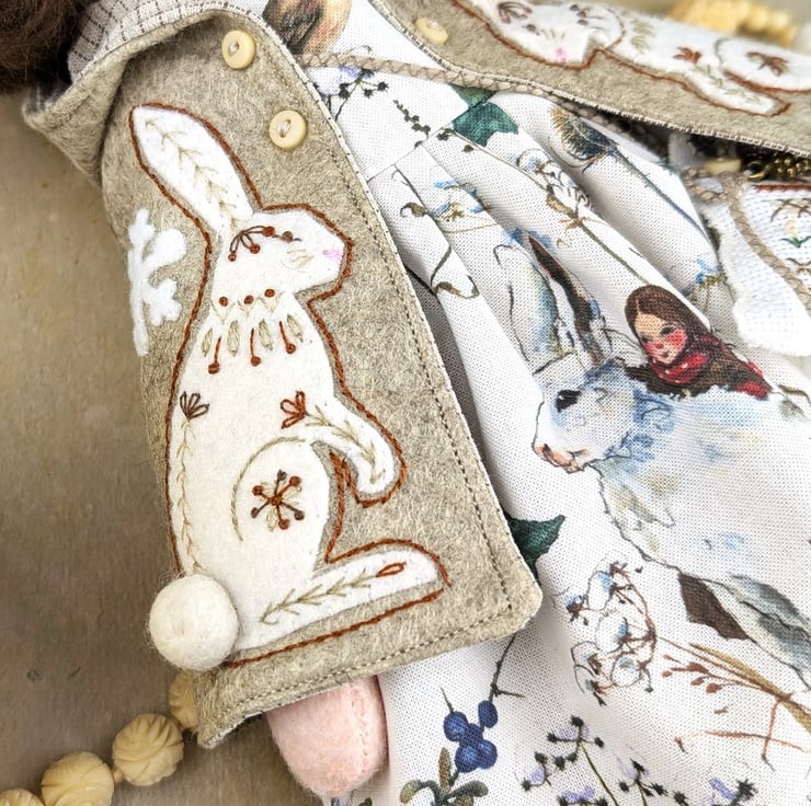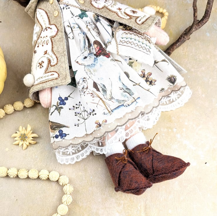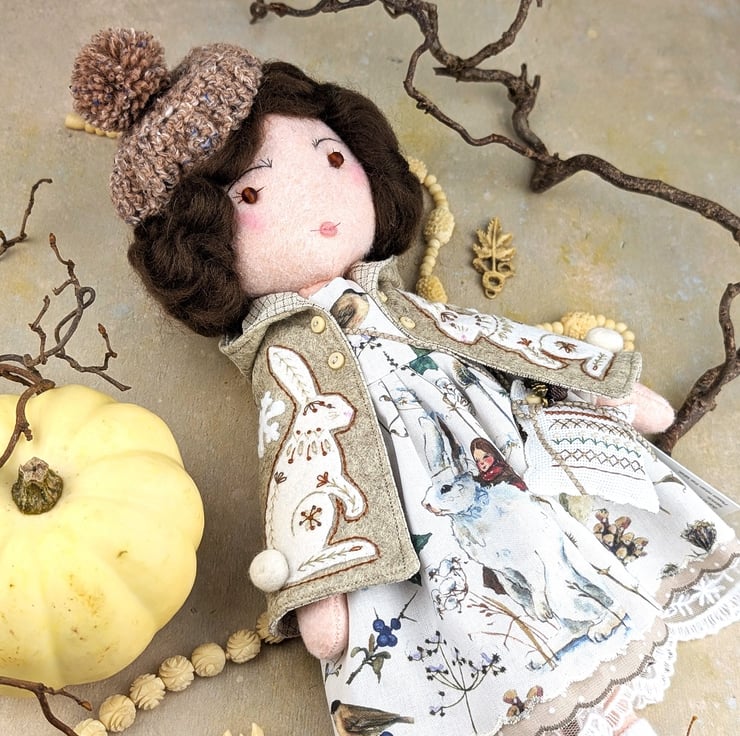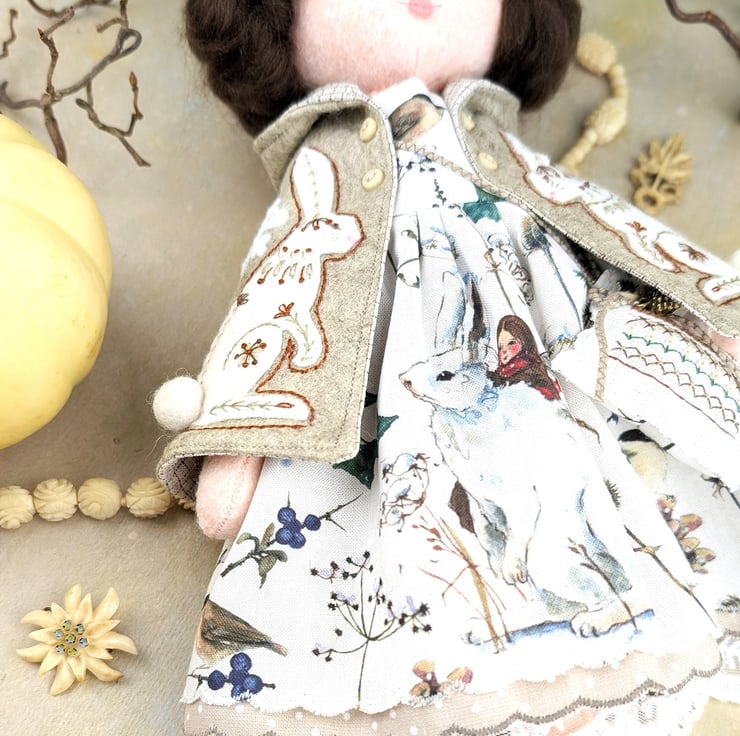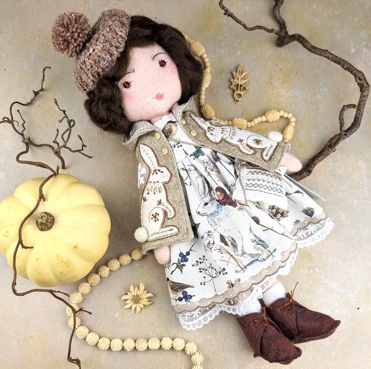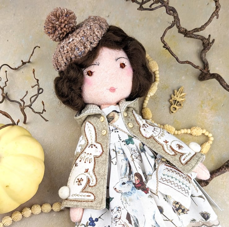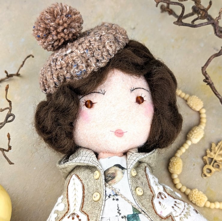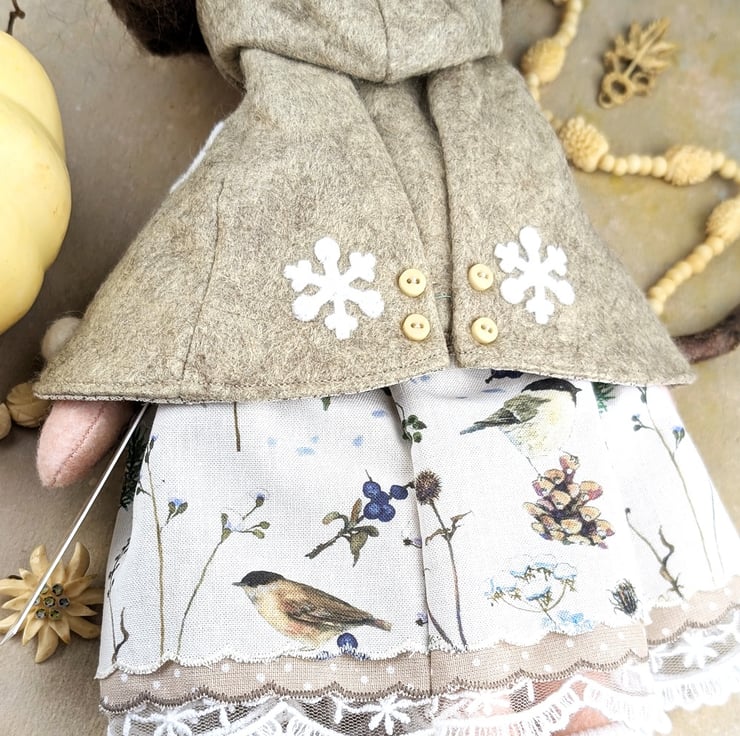 This is Holde,one of the granddaughters of Winter, a doll made from wool felt with glass bead eyes and Brunette wool roving for hair. Her facial details are hand embroidered and her hair is hand styled. She is dressed in an Acufactum print cotton called Winter Fairytale and sports a wool felt warm fawn cloak lined with a soft cream Japanese yarn dyed fabric. Her bobble hat is Tweed Felt Rowan Wool.