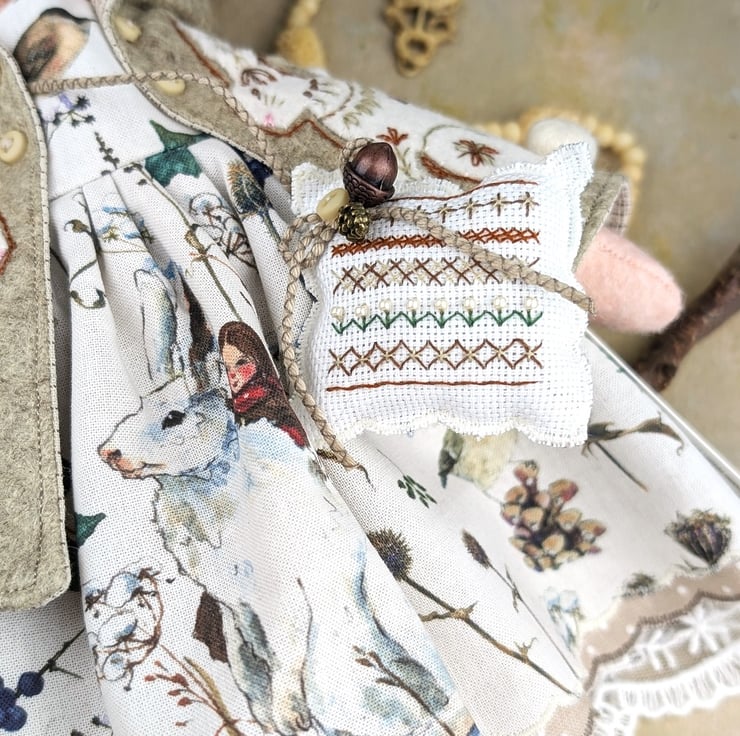 Beneath her dress she has broderie anglais drawers with tiny cotton sock and wool felt boots. Her petticoats are a Acufactum dot cotton with white tulle lace. She is finished with tiny buttons and a sampler pillow. She has tigers eye to her heart.