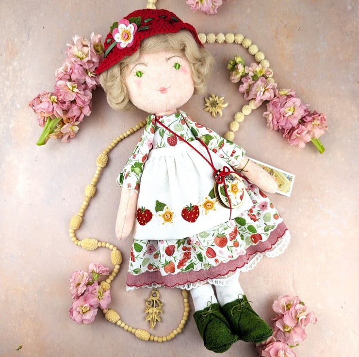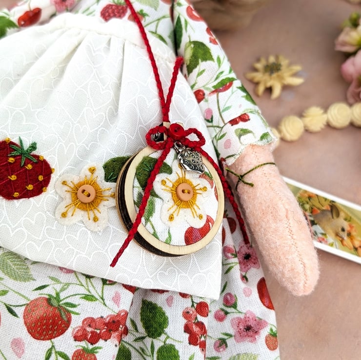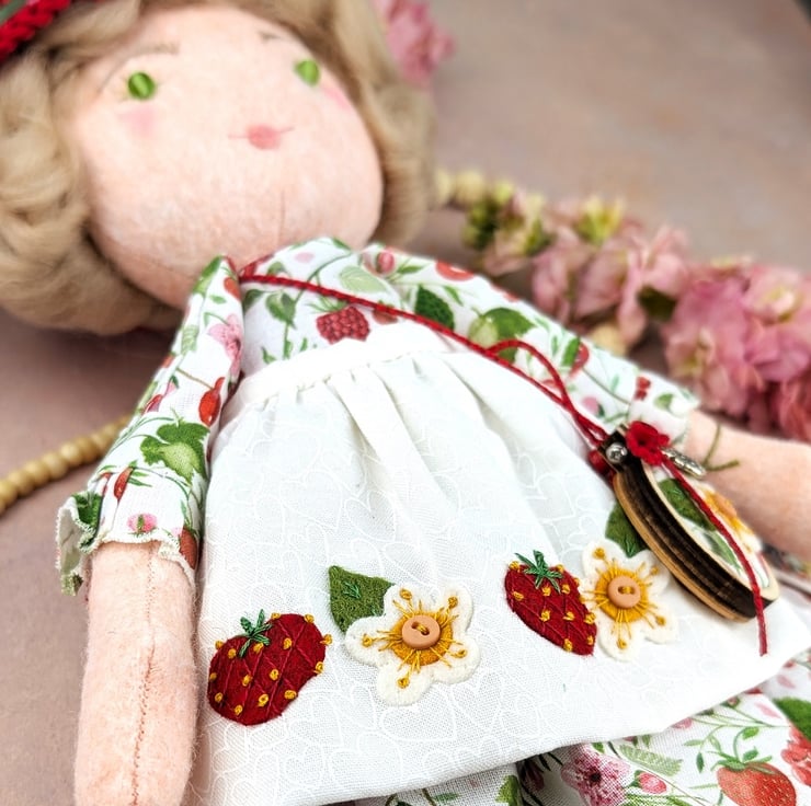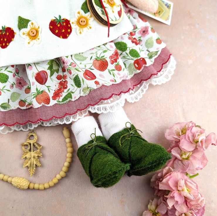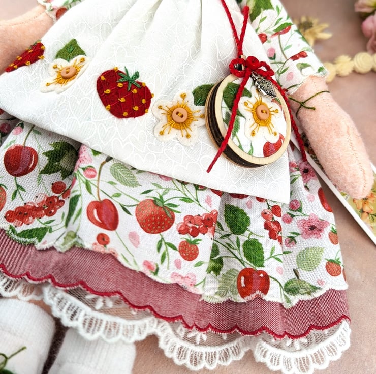Beneath her dress she has broderie anglais drawers with tiny cotton socks and wool felt boots. Her petticoats are a deep red cotton chambray with white tulle lace. Her apron is heavily hand embroidered with a folk art pattern of strawberries and strawberry flowers. She is finished with tiny buttons and a little embroidery hoop flower. She has rose quartz to her heart and dried strawberry leaves to her stuffing.