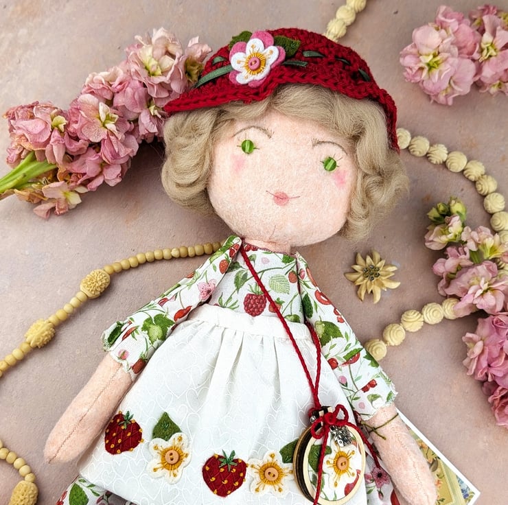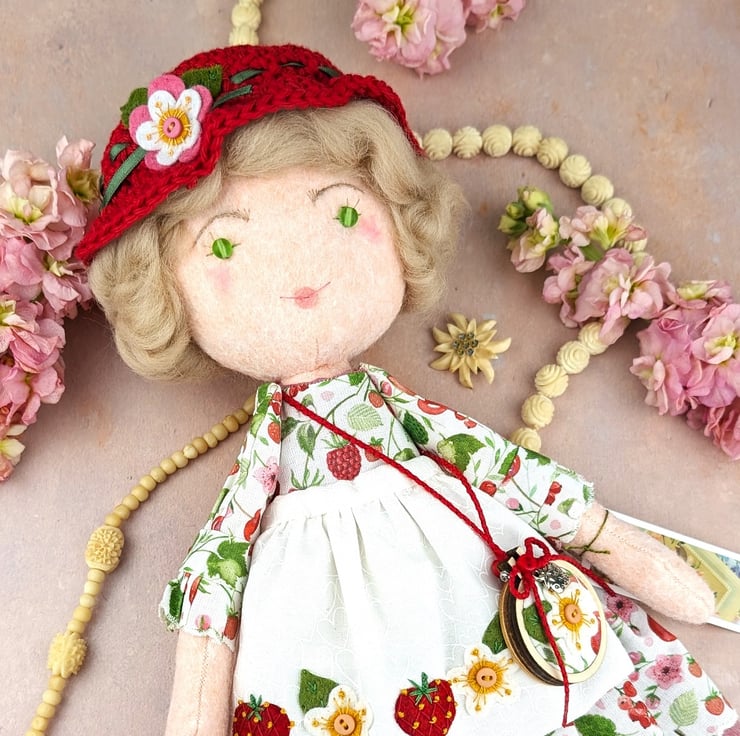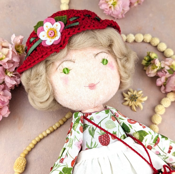 This little doll is my Strawberry Shortcake. She is made from quality wool felt with frosted glass bead eyes and curly blond wool roving for hair. Her facial details are hand embroidered and her hair is hand styled. She is dressed in an Acufactum print cotton called Summer Berry and it features lots of rich summer berries on a white ground. Her cotton bonnet is crocheted cotton with a felt flower..
