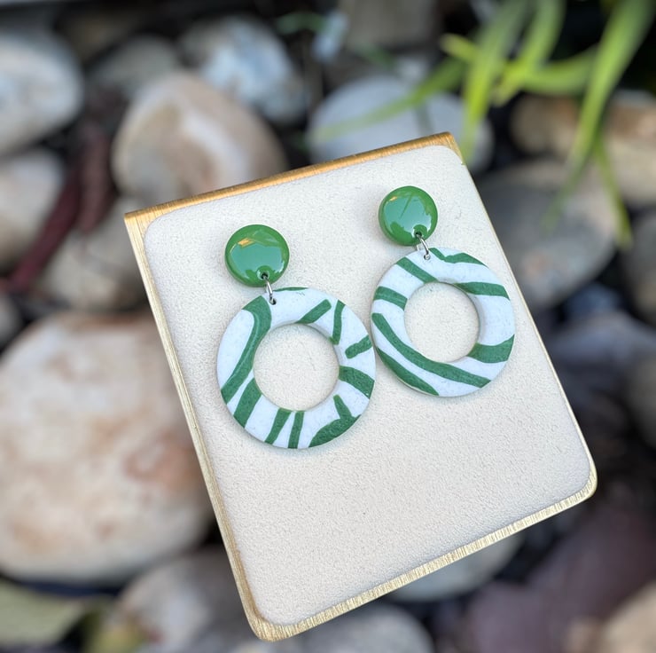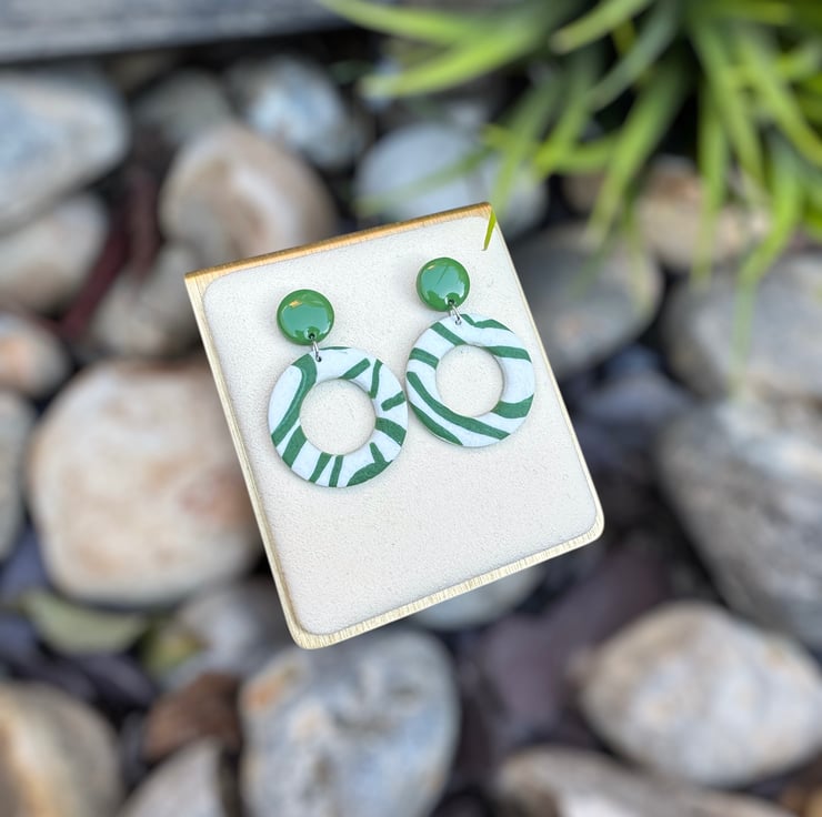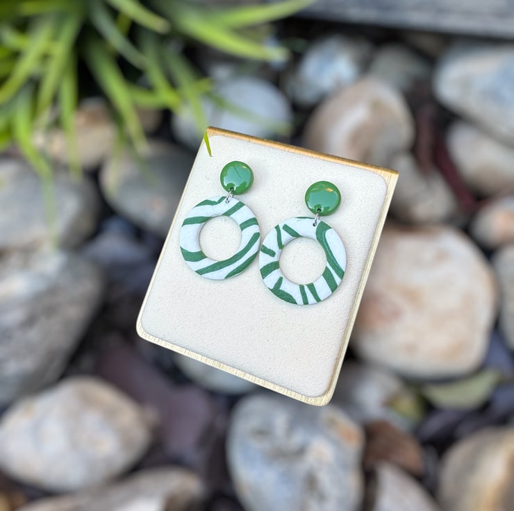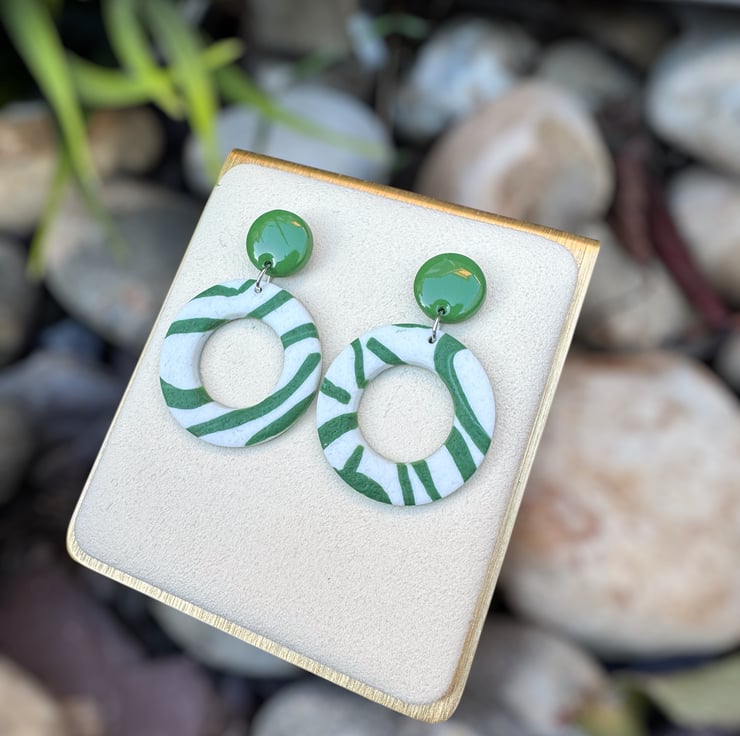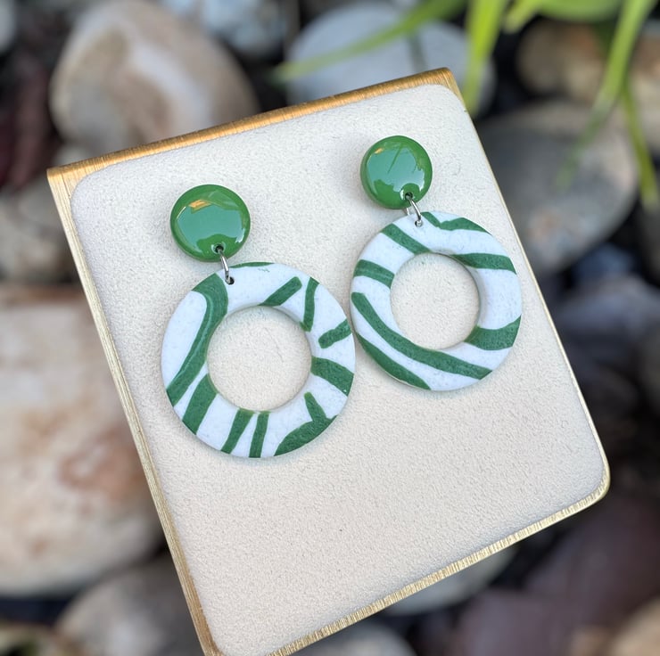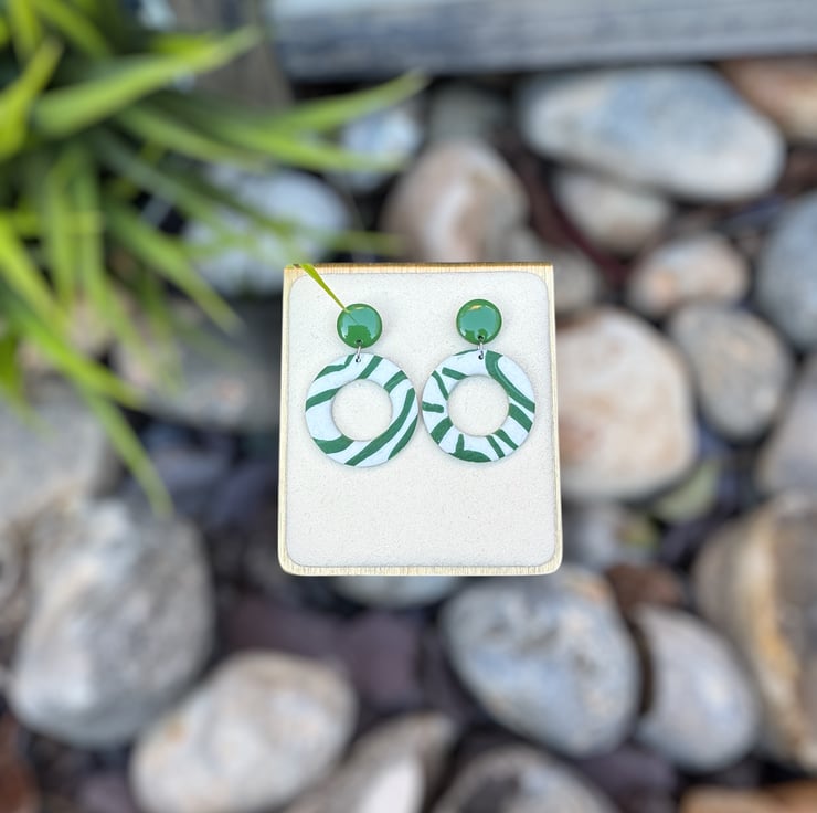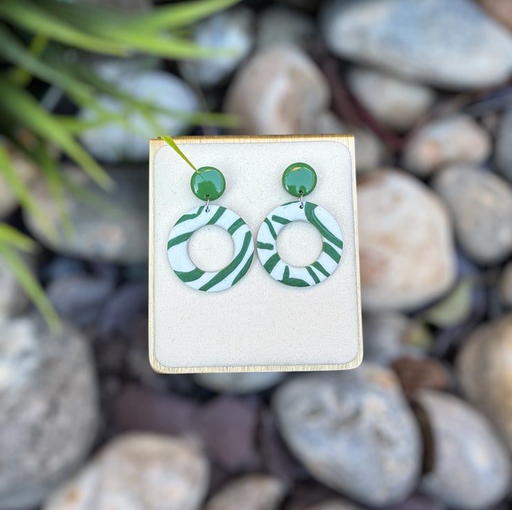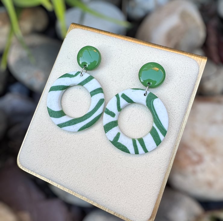 Attached to a textured white polymer clay with abstract forest green squiggle laid polymer clay.