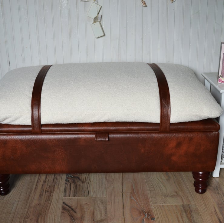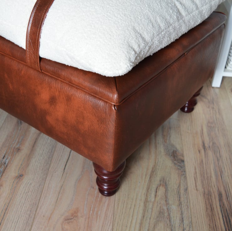 Mayfair Storage Ottoman Footstool Ivory Boucle Fabric With Chestnut Faux Leather