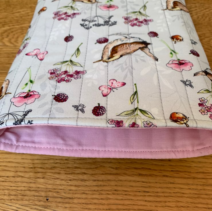 The sleeve is quilted with pale grey thread and is fully lined with plain pink fabric.