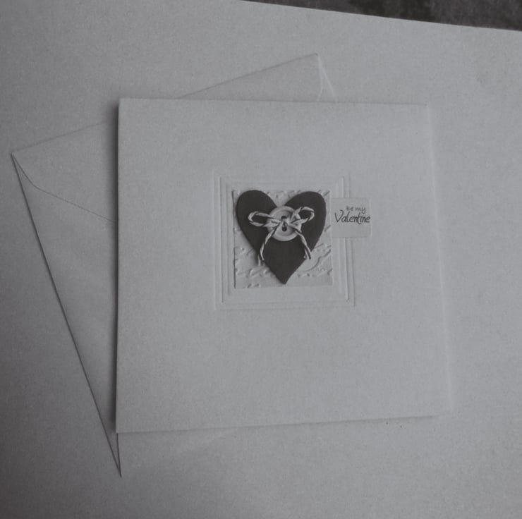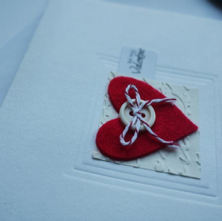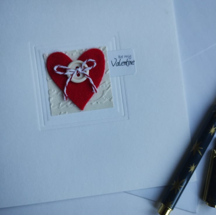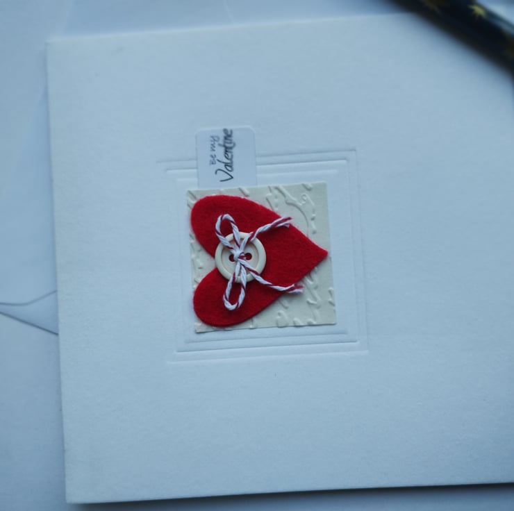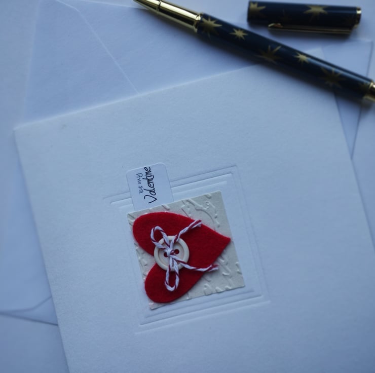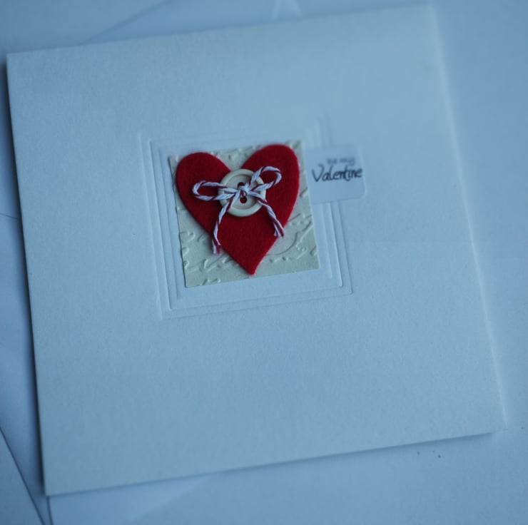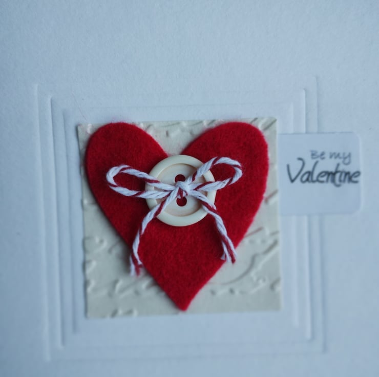 I've cut the lovely felt heart and added a red and white Baker's twine bow. The heart is mounted on square cream paper square which I have embossed in a script pattern. I've added a little tag with the words 'be my Valentine' in a scrolling script.