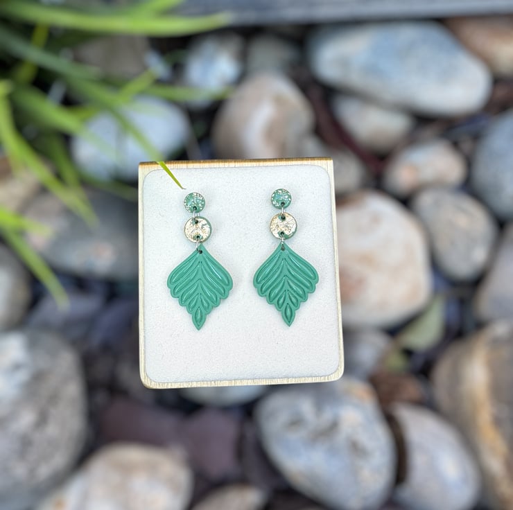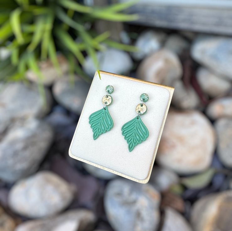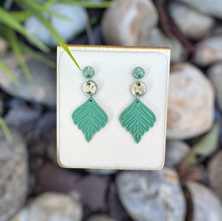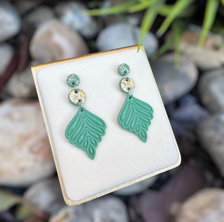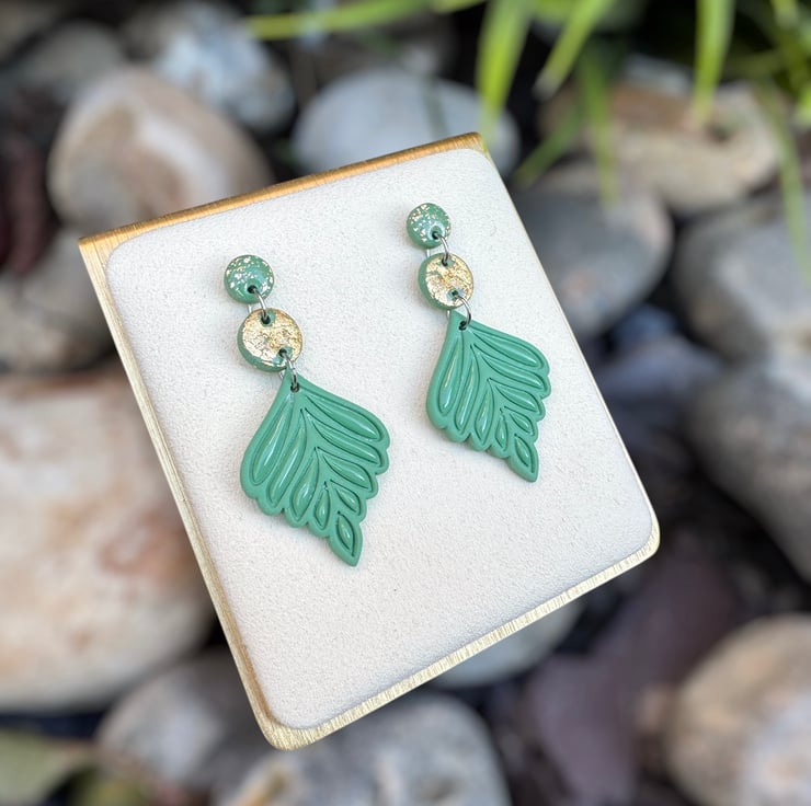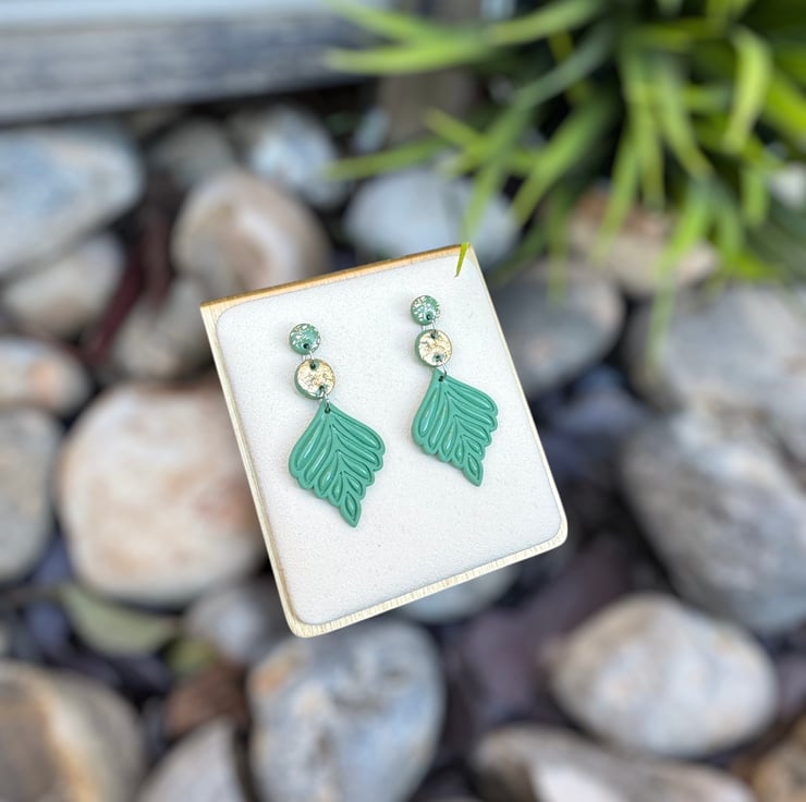 Attached to an elegant ornate leaf shape of sage green. With deep embossed lines adding tactile texture and uv highlights.