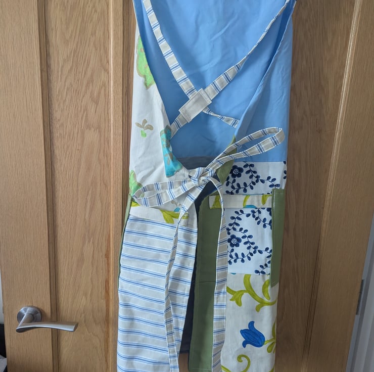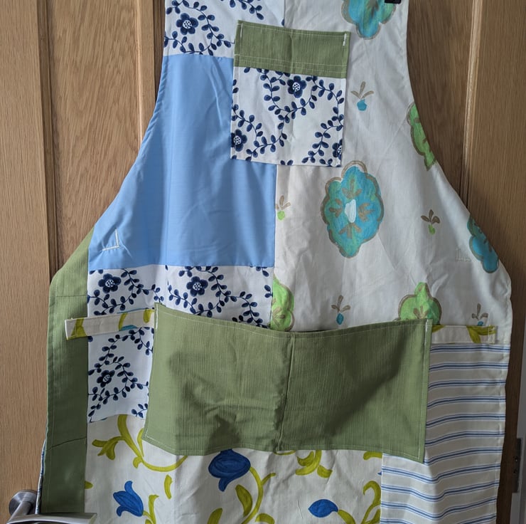 This Cross back apron is made by patch working an arrangement of fabric scraps for previous projects. This one of a kind apron is has a chest height pocket, a lower waist height pocket and two tea towel tabs. This apron is made with practical desire rather then just looking cute!