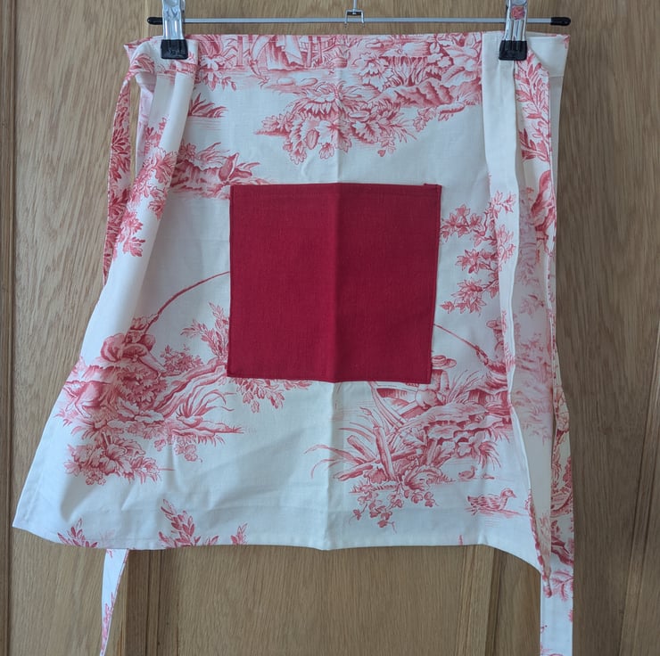 This one of a kind apron is made using a red and cream toile de Jouy patterned fabric this was found in a local charity shop. With only a small amount found a half apron with a pocket with the perfect way to use it.
