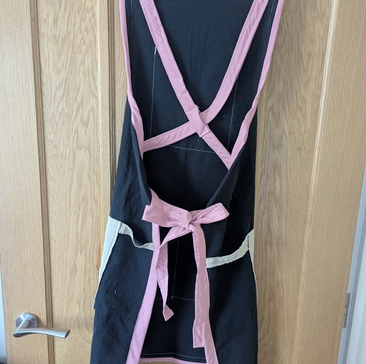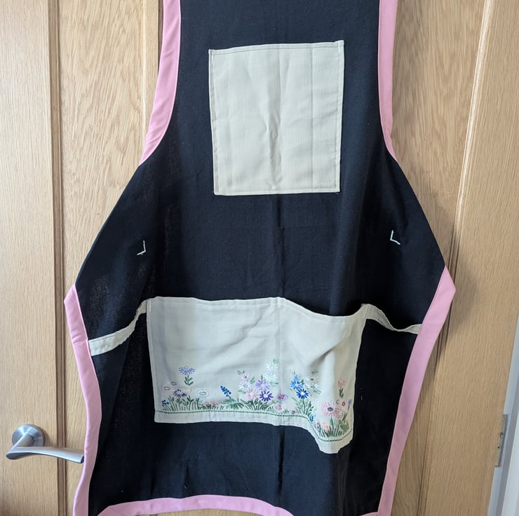 These one of a kind aprons is made using a sturdy light black canvas that has the focal point of an embroidered floral tea towel that I have used as the pockets and the tea towel tabs. This Crossback apron is the perfect gift to be used in the kitchen or garden.