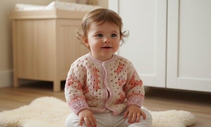 "I wanted to create something that felt like a warm hug. There’s something so special about choosing every shade of pink—from soft cream to vibrant coral—and watching them swirl together into this little cardigan. I made this to be more than just an extra layer; it’s a piece of handmade magic for a special little one to grow into."